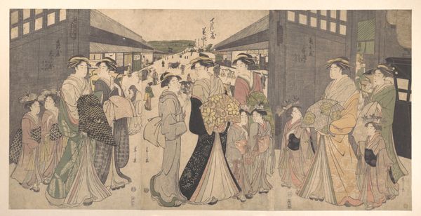 Katsukawa Shunchō made this woodblock print titled *Women Walking by a Moat*. It presents an interplay of geometric and organic forms through the figures' placement against the rigid, tessellated stone wall. The soft pastel palette, punctuated by bold black accents, creates a serene yet subtly dynamic visual experience. The composition divides into distinct groupings, each characterized by unique arrangements of figures. This division introduces a structural rhythm that invites the viewer's eye to navigate the scene, pausing at each grouping to consider the interaction and individual detail. Shunchō’s use of line—delicate in the rendering of the figures’ robes, firm in the architectural backdrop—serves not only to define form but also to establish a hierarchy within the composition. The stark contrast in texture between the smooth surfaces of the garments and the rough stone further enriches the visual experience. Ultimately, the artwork destabilizes traditional notions of depth and perspective. By flattening the pictorial space, Shunchō engages in a dialogue with contemporary ideas about representation and challenges us to reconsider how we perceive space.