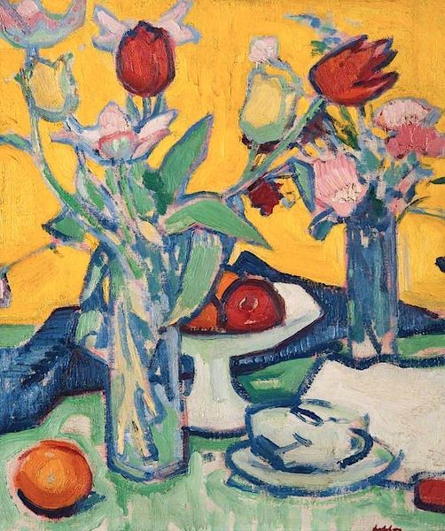Curator: Samuel Peploe’s "Tulips," painted in 1923, offers a delightful insight into the Scottish Colourists movement, particularly how they engaged with Post-Impressionist ideas. Editor: It's striking how Peploe's bold, almost aggressive brushstrokes animate an otherwise simple subject. The colour relationships—particularly that muted, almost bruised, purple against the brighter pinks and reds—create a restless visual energy. Curator: Absolutely. These artists, the Scottish Colourists, positioned themselves in an interesting relationship to the conservative Scottish art scene of the time, acting as a bridge to European Modernism and shaping cultural attitudes toward it in Scotland. Peploe spent extended periods in France absorbing current Post-Impressionist practices. Editor: And it’s very evident here, look at the flatness of the picture plane! It reminds one of Cezanne's flattening of space and bold outlines that create form as much as delineate it. And this attention to composition--that dynamic tension between the verticality of the blooms and the horizontal tabletop! It seems self-consciously modern. Curator: Right, and still life paintings allowed Peploe and his cohort like Cadell to experiment without making direct statements, offering them latitude when showing this style in more conventional, portrait-dominated public displays in galleries at the time. This gave them more social acceptance, if you will, into the somewhat traditional gallery climate in Scotland. Editor: So, the still life, a seemingly innocuous genre, actually provided an avenue for formal experimentation and cultural negotiation? Intriguing. Yet, divorced from this knowledge, I appreciate the almost childlike simplicity in its execution; a raw but earnest attempt to wrestle colour into form. Curator: It certainly captures a fresh sensibility, revealing how art both mirrors and moulds the society from which it comes. It demonstrates the capacity of artists to test new ideas in contexts of historical expectation. Editor: Well said. Seeing this "Tulips" afresh offers new insight into formal artistry with complex history.