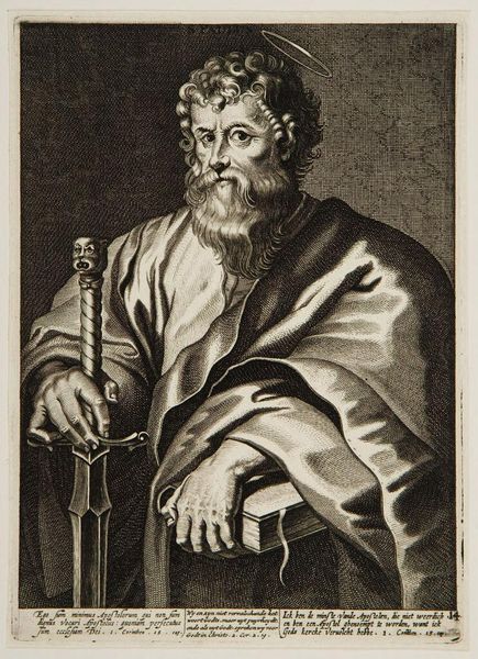 Curator: This is Nicolas Ryckemans' print, "Saint Andrew," a striking depiction rendered with incredible detail. Editor: The weight of the cross! And the fabric, draped so heavily... It's quite somber, isn't it? Curator: Absolutely. Consider the cultural context of religious iconography. Andrew, with his association with martyrdom and faith, represents a complex nexus of power, suffering, and belief. Editor: The cross looks almost tactile, like rough timber. I wonder about the etching process. Was it a laborious endeavor? Who was involved in its production beyond Ryckemans? Curator: That's a valid point. This print raises questions about the social dynamics influencing artistic creation and the impact of religious narratives on artistic representation. Editor: Seeing it this way really highlights the human element in faith and production. Curator: Indeed, it's a thought-provoking piece.