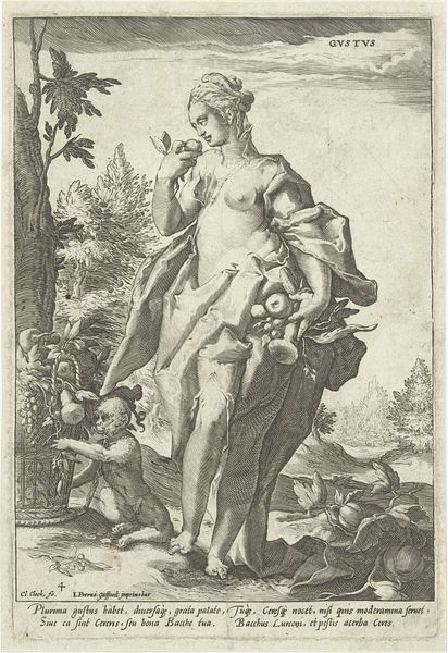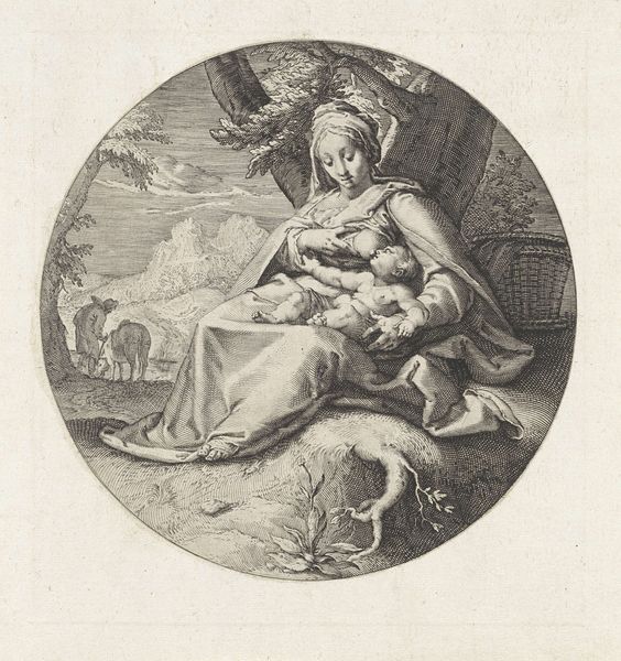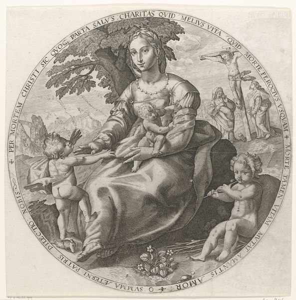 Curator: Hendrick Goltzius created this engraving, "De boetvaardige Maria Magdalena" or "The Penitent Mary Magdalene", in 1582. Editor: It's overwhelmingly somber, wouldn’t you say? The starkness of the engraving really emphasizes the penitent mood. The tight, controlled lines almost feel claustrophobic. Curator: Goltzius's style blends Northern Renaissance realism with a nascent Baroque sensibility, which is quite interesting, especially given the religious context of the Counter-Reformation. This engraving circulated widely, influencing perceptions of Mary Magdalene as a figure of repentance and spiritual devotion during a period of intense religious debate. Editor: The composition is meticulously arranged. The oval frame neatly contains the subject, emphasizing the inward focus. See how the diagonals—the line of the book, the placement of the skull—direct our eye towards her clasped hands, the center of emotional weight? Curator: Absolutely. Those elements contribute to a powerful vanitas theme. The skull, the open book, even the wilting plant all point to the transience of earthly life. The portrayal of Mary Magdalene connects personal grief with the larger understanding of life’s brevity and the path to salvation through penitence, reflecting anxieties common to the 16th century. Editor: I find the figure itself so compelling. Look at the rendering of her face, the subtle shading hinting at tears, the intricate detail of her cascading hair contrasting so powerfully with the starkness of the surrounding symbols of mortality. It’s technically dazzling and emotionally stirring. Curator: And behind her, almost faded in the background, is what appears to be the crucifiction. Editor: It provides a grounding to why exactly Magdalene feels repentance for. Overall the darkness adds a sense of realism, as if glimpsed in shadows of the divine. A masterclass in symbolic engraving. Curator: It is a reminder that the narratives conveyed in art were powerful shapers of belief. Editor: Yes, definitely. Its compelling blend of technical virtuosity and emotional depth ensures its resonance through time.