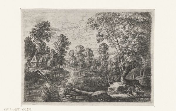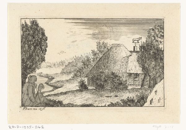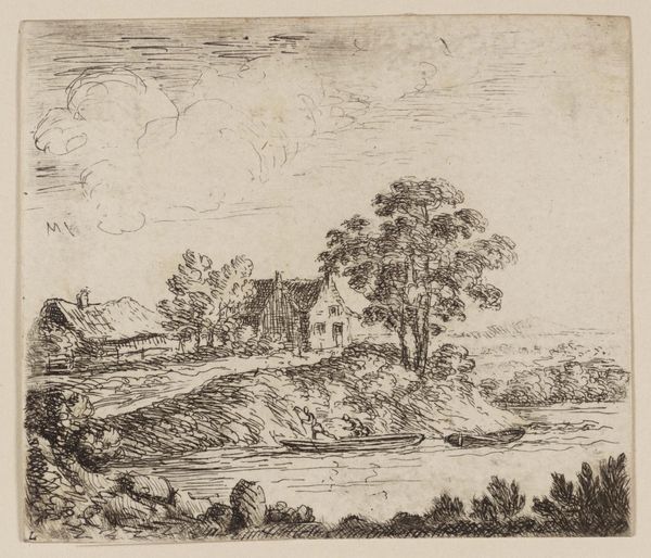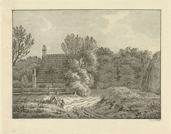 Curator: This delicate etching is by John Baptist Malchair, an artist active in the late 18th and early 19th centuries, currently held in the Tate Collections. Editor: It's so charming. I love the density of the etched lines, how they almost create a woven texture, like some kind of handmade fabric. Curator: Absolutely. The texture speaks to the labor involved in printmaking at the time, and how the materials—the plate, the acid—would interact. We can think about the cottage and its relationship to rural labor too. Editor: Yes! The image feels deliberately un-idealized. We can see the cottage is nestled in the landscape, but it's not romanticized. It feels like a document of work and place. Curator: And within that ordinariness, it holds a certain power to reflect on changing modes of production and the role of landscape in shaping social identities. Editor: Ultimately it's a testament to the artist's skill in manipulating a difficult medium. It’s a small, intimate work that encourages us to look closer at the world around us. Curator: A poignant point to end on, focusing on the intimate scale but also its relationship to society more generally.