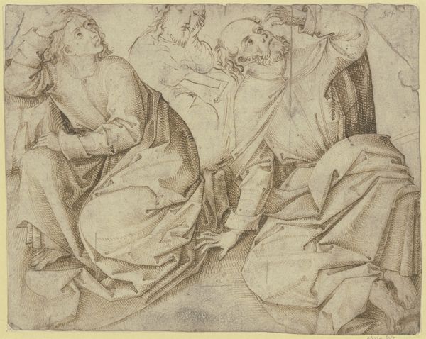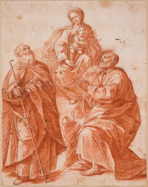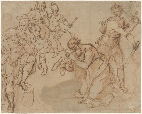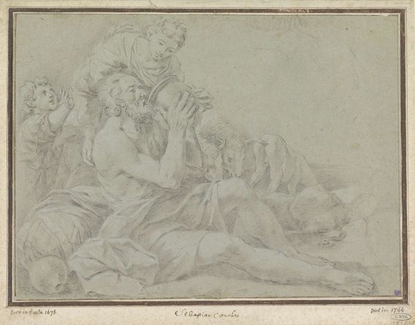 Editor: This drawing, "Studies van een knielende man, halffiguur, arm en buste," by G. Ladan, dates from sometime in the 1700s, created with pencil and charcoal. There’s an energy here that feels raw. What aspects of this artwork grab your attention? Curator: It’s interesting you say raw. For me, this is a prime example of baroque era’s embrace of preliminary sketches not as means to end but also for pedagogical uses: students had to practice relentlessly in the hopes of mastering drawing. Looking at the type of pencils or charcoal, its crafting process, and then how this simple material enabled Ladan or his school to study the musculature and posture of a kneeling man. Editor: So you’re saying the value is less in the final image, and more in understanding the physical creation, like a kind of labor captured in lines? Curator: Precisely. And how it relates to art production. Think about the societal structure: who had access to these materials? Who was afforded the leisure to study and practice? This drawing represents more than just an aesthetic exercise, but the socioeconomic structures underpinning art itself. It represents a learning material that not only shows you how to draw, but what it means to learn the drawing process. Editor: That makes me look at it in a different light; the artwork embodies the artistic, intellectual, and, perhaps, manual labor. Curator: Indeed. Consider the implications, how this challenges traditional boundaries, intertwining ‘high art’ with the realities of labor and production inherent in even seemingly simple drawing. Editor: Thank you, that's given me a lot to think about regarding material use and production, particularly around access and labour that’s often unseen. Curator: And I in turn am reminded of the artist's intimate engagement with his materials!