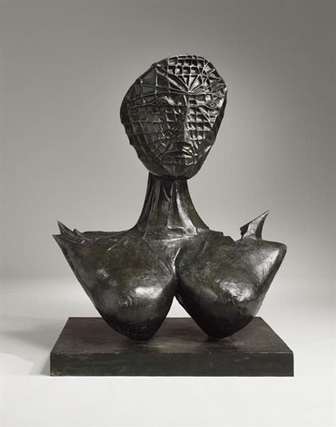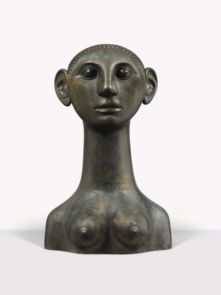 Curator: This is Henri Matisse's bronze sculpture, "Jeannette V," created in 1913, now residing at LACMA. What's your initial reaction to it? Editor: The surface has this incredible fluidity to it, like cooled molten rock. The bronze captures a sense of movement even though it's a static portrait. I'm intrigued by the material and its transformative journey from liquid to solid. Curator: For me, it’s all in the eyes and the overall shape of the face. They seem both vulnerable and defiant. What cultural touchstones was Matisse drawing from to distill the human face to these striking elements? Editor: Well, we know that Matisse explored themes of abstraction versus representation at the time, right? He was interested in moving beyond faithful rendering, and into how raw materials – bronze here – can express ideas. What was possible with industrial processes. Curator: The face does echo ancient sculptural traditions of course. But the way the features are simplified, almost mask-like, also speaks to primal or archetypal identities. There's an intentional stripping away of specific personality, which opens it up to wider interpretations. What kind of statement was Matisse trying to make about art and industry through material consumption at that point in history? Editor: Interesting, but isn't that true of early Modernism? The ready made. The interest in primitive forms and simplified shapes wasn’t unique to him, though his understanding of craftsmanship sets him apart. Matisse spent years honing his craft through different medium and at different schools. The materiality betrays those labor origins! Curator: Indeed! The final casting and polishing would have required significant skilled labor as well. But back to the form: do you think it successfully channels emotions without relying on familiar portrait conventions? Editor: The exaggeration is there, as a result of working with industrial material perhaps. The surface texture adds a very sensual quality that is kind of a primal power. It suggests inner turbulence beneath a composed surface. Curator: So, while this "Jeannette" appears still, perhaps this bronze actually reflects a restless spirit, not just of the woman, but the epoch of its making, as well. Editor: Right. It leaves me thinking about the impact of industrial materiality on subjective interpretations of emotion through art-making.