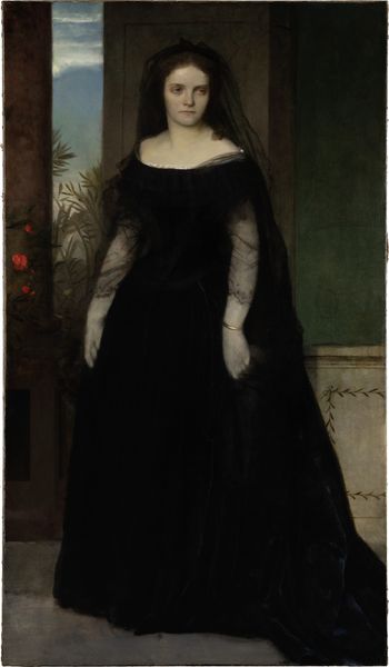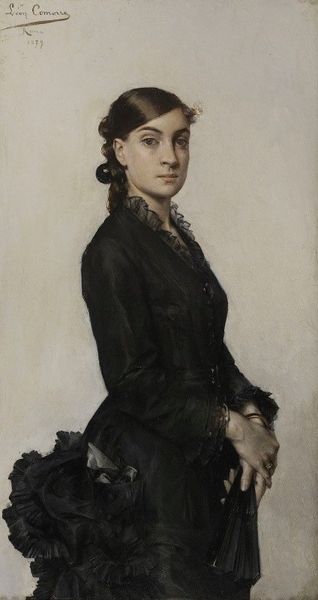 Curator: Painted in 1879, this is William Merritt Chase's portrait of Harriet Hubbard Ayer. Immediately, one notices the subject's demure pose, hands clasped in front of her, and her somber black attire. What's your first impression? Editor: Austerity. Her dark clothing set against the pink background creates an atmosphere that's both elegant and melancholic. I find myself wondering about the social constraints she may have been experiencing. Curator: That’s interesting. Considering Chase's connection to the New York art scene, it’s helpful to contextualize Harriet's attire. Her dark lace dress might be making a specific kind of fashion statement – perhaps one that speaks to her social standing within a specific societal framework. Editor: Definitely. This image really makes me question societal expectations of women in the late 19th century, from dress codes to behavior. The subtle way Chase renders her expression also suggests inner strength, or perhaps even resilience, against those expectations. Was it also common at this time for artists to create a "dark lady" figure in portraits, or at least this is what I call her due to her color scheme and attitude, in the image of powerful bourgeois? Curator: Precisely! Academic art in general served to reinforce social structures. And yes, depictions of bourgeois figures such as Harriet was to make some kind of statement on what society was supposed to look like. Let's delve a little deeper: note the artist's use of impasto technique, visible especially on the dress and in the rendering of her skin, adding depth to her character. This method of expression can reflect upon what Chase has observed. Editor: Absolutely, technique isn’t ever really divorced from intent, especially when dealing with portraits like these. To think about the labor required to make those gestures appear on canvas tells us just how significant an expression, costume and colors can become for both the artist, model, and potential buyer. It makes me feel almost voyeuristic as a viewer— as though I'm peering into a secret, guarded life. Curator: I agree entirely. When one examines paintings such as this closely, the power dynamics at play become much clearer. Ultimately it reflects our contemporary perspective, inviting discussions on women's representation within artistic contexts. Editor: Right. It pushes us to reflect on how far, or how little, representational progress we've made today when it comes to race, class, and gender in art.