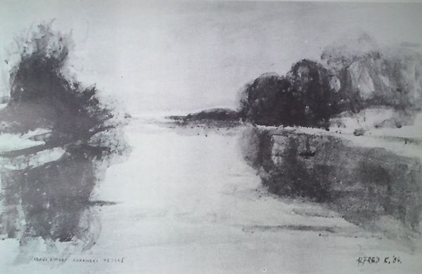 Curator: This is Thomas Moran's "Green River from the Ferry, Wyoming Territory," a watercolor and gouache work completed in 1889. Editor: The muted tones are immediately striking. It feels vast, silent almost, and the water has this wonderful reflective quality. There is a very interesting contrast, because, even with those earth tones, the small details seem to catch the eye and reveal a whole, massive and imposing landscape. Curator: Moran, a key figure in the Hudson River School, often depicted the American West, fueling its romantic imagery and enticing settlers. But beyond pure romanticism, this piece provides insights into the history and representation of Western landscapes in American visual culture. The work certainly showcases an interesting interplay between objective observation and idealized representation, shaping the vision of the West. Editor: I'm drawn to his choice of watercolor and gouache—the subtle layering seems deliberate, creating that feeling of a heat-hazed vista. There's an intimacy despite the monumental scale of the land. Think of the accessibility of these materials compared to oils - a portability that suggests immediacy. How do you think it impacted the audience of the time, if, because of those means, this scenery became increasingly democratized and consumed by those with little or great knowledge? Curator: Absolutely, that increased access shifts everything! Consider how this painting was reproduced and circulated. It contributes to the perception of the West as both sublime and tamable, playing a role in justifying westward expansion policies. It’s art actively participating in the political sphere of its time. Editor: Seeing the marks of its making lets us trace how its message became so amplified, reaching people. It serves as an insight to its material production. Curator: Indeed, thinking about "Green River" in relation to these narratives helps us deconstruct the layered meanings imbued in Western landscape painting. Editor: The subtleties here tell more of the story when we consider the hands and choices behind it. Thanks for enriching my appreciation of the material's reach beyond the vista.