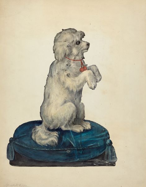 Curator: Allow me to introduce George File's "Bull Dog Bank," a watercolor and pencil drawing created around 1937. Editor: Immediately, those blood-red eyes jump out! And the metallic sheen to the bulldog itself, perched so rigidly on that box. It’s simultaneously intriguing and a little…unsettling. Curator: The caricature strikes a specific tone, doesn't it? Bulldogs at this time were potent cultural symbols – often employed as mascots of institutions or as patriotic emblems, particularly during periods of political tension. Considering the date, we must acknowledge the shadow of pre-war anxieties in its creation. Editor: True, but the way the artist renders the surface texture... look at the glazes of watercolor, built up to create the illusion of metal or aged ceramic. And that dark studded collar adds such a harsh definition around its neck. The contrast between that rigid collar and its almost sickly coloring speaks volumes. Curator: Precisely! The contrast implicates the economic anxieties of the era. Was this bank perhaps a commentary on financial institutions as being guard dogs over limited wealth, protected by almost violent means? Consider who was excluded at that time based on gender or race. Editor: The use of line and tone here is particularly compelling. See the economical, but powerfully expressive use of pencil to delineate its musculature. There’s something fundamentally satisfying about how File captures the essence of “bulldog-ness.” Curator: And on a subtler note, it could even be construed as a representation of masculinity at a critical juncture. Editor: You’re pushing toward issues of gender and power? It might fit there! This work prompts more questions than it answers—which in itself, I think, is a strength. Curator: I'd agree. Its value lies in how it can start critical conversations. Editor: I must admit, analyzing the composition has deepened my understanding of this unusual and interesting object.