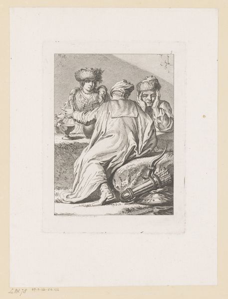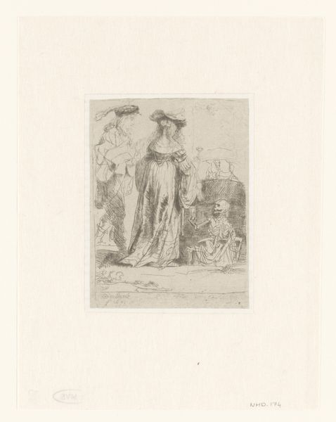 Editor: This is "Karikaturale voorstelling van een man en een vrouw," a print from somewhere between 1620 and 1687 by François Collignon, currently housed in the Rijksmuseum. The grotesque figures are intriguing and the linework seems almost nervous and frenetic. What can you tell me about this print? Curator: Well, observe first how Collignon has deployed line itself. Notice the contrast in weight, density, and direction to model form and create texture. See the subtle variations to articulate the fabrics, for example, in the man's flamboyant hat compared to the woman's simpler garment. Editor: It’s interesting how much information he conveys with just lines. Is that characteristic of prints from this time? Curator: Indeed. The emphasis here is not on illusionism, but on the expressive potential of the line itself. Consider the very limited tonal range, constrained by the medium of engraving. Focus on *what* is represented – exaggerated features, peculiar attire – but more importantly, *how* it is represented through the masterful use of line, composition and arrangement of elements. What overall impression does this *how* convey? Editor: The linework and exaggeration lend themselves to an air of mockery and playfulness. Curator: Precisely. It is through the artist's deliberate manipulation of form and line that this mood is successfully conveyed. This artwork compels us to decode how artistic choices manifest intended effects. Editor: So, we shouldn’t look too much for symbolism here, but instead see how the formal choices create the humour. Curator: Exactly. By closely analyzing the formal elements of this print—line, composition, and the artist's hand—we gain insight into its satirical nature. We find an expression beyond the depicted scene itself. Editor: That really does change how I see this print. Thanks. Curator: My pleasure. Always begin by analyzing the image itself. The rest emerges.