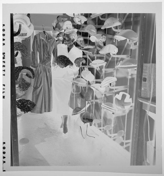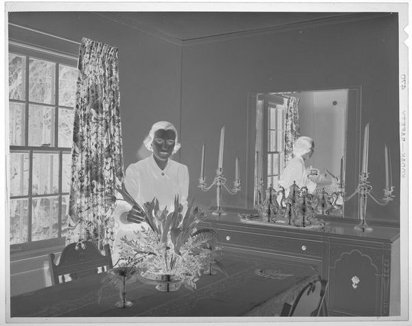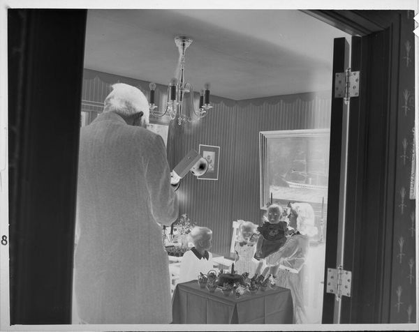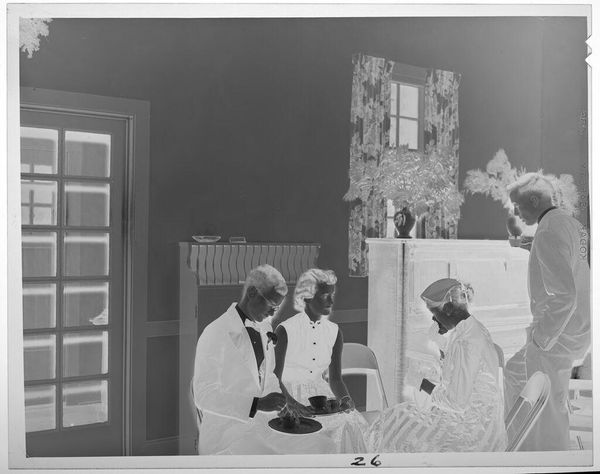Editor: This photograph, simply titled "Untitled (people at party in living room)" by Lucian and Mary Brown, captures a social gathering. The inverted tones lend a ghostly quality to the scene. What cultural echoes do you hear in this image? Curator: The negative evokes a sense of memory, doesn't it? Like peering into the past. The figures, caught mid-gesture, possess an almost ritualistic quality. Notice the prominence of books in the background. What does that tell us about the sitters and the cultural aspirations of the time? Editor: It suggests intellectualism, perhaps a striving for upward mobility. Curator: Precisely. The image becomes a study in social codes, where clothing, setting, and even the act of gathering itself communicate deeper values. A fascinating glimpse into a bygone era. Editor: I hadn't considered how the photograph’s elements work together to convey so much meaning. Curator: Indeed, images speak volumes when we learn to listen closely to the symbols and arrangements within them.