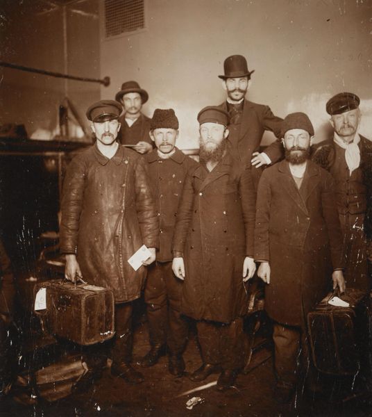 Editor: This photograph, titled "Races, Immigration," captures a large group of people at the New York Immigrant Station. The sepia tones lend a somber mood. What strikes you most about its composition? Curator: The formal arrangement is quite striking. Observe how the artist, J.H. Adams, structures the figures: a dense layering creating a complex interplay of light and shadow. Note the architectural geometry framing the subjects. Editor: That's a keen observation! I hadn't considered the interplay of the figures with their architectural surroundings. It really enhances the feeling of confinement. Curator: Indeed. The composition, beyond its representational function, evokes a sense of spatial dynamics through its tonal variations and structured forms. It's a study in contrasts. Editor: Thank you. I'm starting to see how the artist uses form to emphasize the emotional impact of the photograph. Curator: Precisely. It's a powerful demonstration of how formal elements can shape our perception.