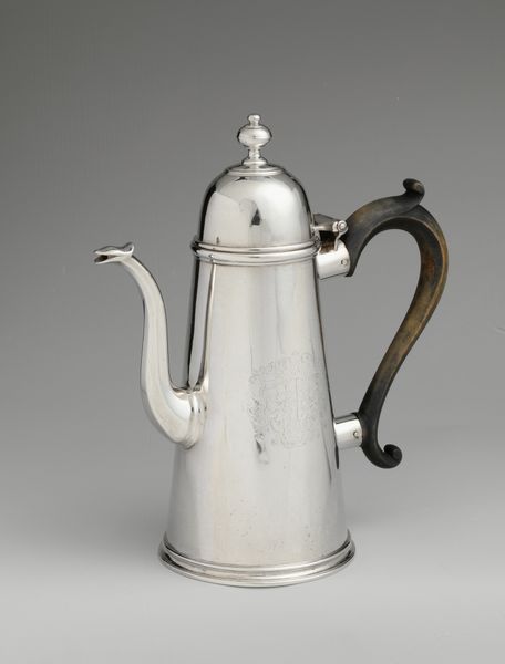 Curator: This elegant object is a miniature silver coffeepot with a hinged cover, dating back to 1705-1706. You can find it here at the Metropolitan Museum of Art. Editor: Tiny! And somehow forlorn. It makes me imagine secret rendezvous and whispered conspiracies over too-strong coffee. The Baroque was nothing if not dramatic! Curator: Indeed. The use of silver suggests luxury and status, indicating that coffee consumption at the time was a privilege. It's intriguing to consider who would commission such a small, decorative item. Was it a traveling piece, a child’s toy, or a display of craftsmanship? Editor: I wonder if anyone actually used it? All that polished silver would have burned your fingers, I bet! But seriously, this form speaks to a grander scale, to the idea of ritual and performance in even the most everyday activities. Curator: And that hinge tells us something about design and the need for functionality, even in these decorative objects. Silver’s malleability allowed artisans to chase complex forms that imitate the high-end style, accessible now through miniature domestic items. Editor: Absolutely. The scale is fascinating because it reduces something grand to something intimate, personal. It makes me feel like I am eavesdropping. Is that just me? Curator: Perhaps, or it may underscore its ties to the era's fascination with elaborate detail and social rituals. It’s hard to dismiss the piece simply as ornamentation when the tooling itself implies labor. Editor: It’s more like a time capsule holding secrets to be shared over that tiny cup of joe. What better use is there for such dedicated handiwork? Curator: Agreed. The miniature form presents this interesting tension between function and display—what it offers us in scale, it certainly repays in detail. Editor: A potent distillation. After contemplating it, this little pot is an echo from another world.
