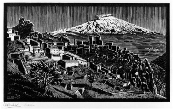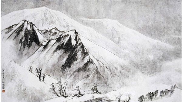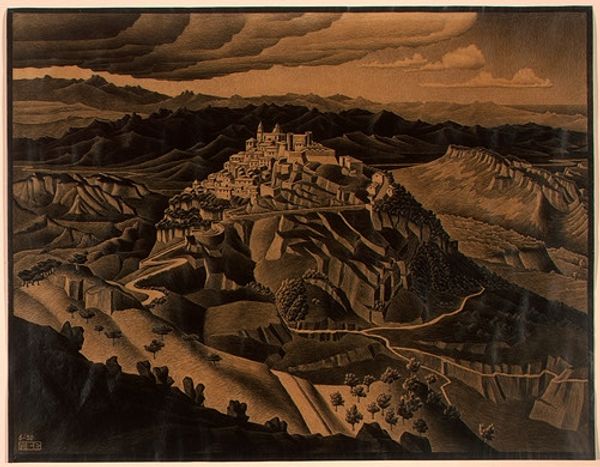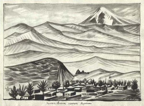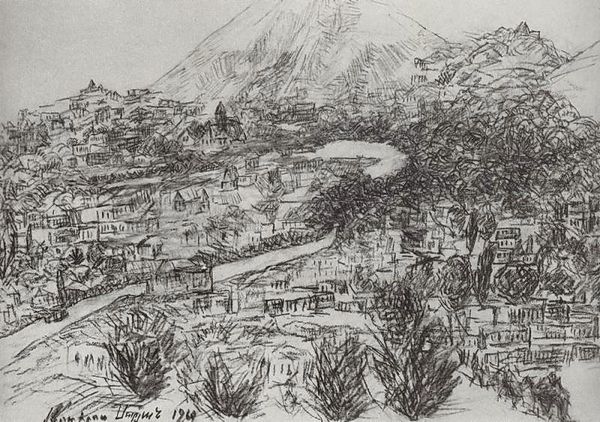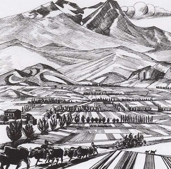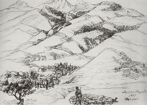 Editor: This is Martiros Sarian’s "Armenia," a graphite and pencil drawing from 1934. There’s something quite striking about its composition—the sharp, almost theatrical framing of the mountains around the central scene of the village and fields creates a sense of depth and perspective. How would you interpret this work based on its visual elements? Curator: Immediately, one is drawn to the dynamic interplay of lines. Observe how the stark vertical lines of the foreground frame contrast with the softer, more rounded forms of the mountains in the background. Consider also the artist’s careful application of tone— the dense, almost sculptural quality of the mountains versus the more delicate shading in the village below. What effects do these visual decisions evoke, in your estimation? Editor: It feels like a staged presentation of Armenia. The harsh lines almost act like curtains framing the serene landscape, focusing the viewer's attention. The mountains possess a powerful, dominating presence through the texture and shading. Curator: Precisely. And how do these formal elements contribute to the overall meaning or effect? Think about the relationship between the landscape and the figures within it. Editor: The lines of the cultivated fields draw you into the center, towards the figures. This emphasis of man and labor, contrasted against the sheer grandeur of the natural landscape, creates an interesting juxtaposition. It’s not just a landscape, it’s a landscape shaped by human presence. Curator: A well-reasoned assessment. Indeed, Sarian is not merely depicting a landscape but constructing a visual argument about the relationship between humanity and its environment. Do you see other examples of how such relationships influence art? Editor: The framing does make me think of renaissance art which often uses people as frames. Thank you; considering how the formal elements are used and how that emphasis informs a work has made me see the drawing in a totally new way. Curator: My pleasure. Engaging with the formal qualities in such a way allows us to approach works of art with the required close attention.