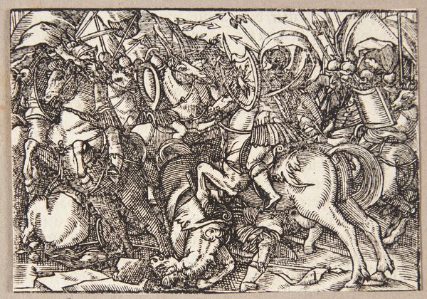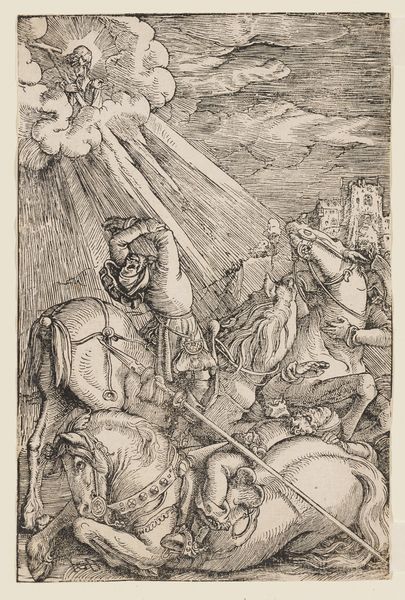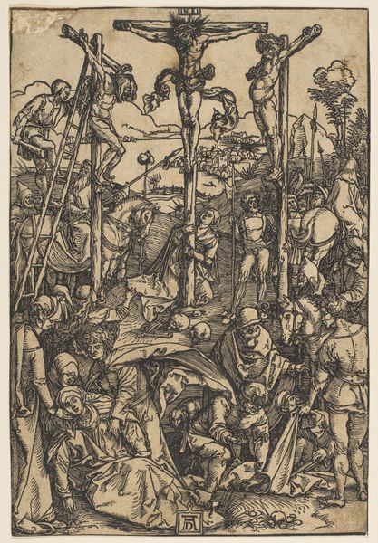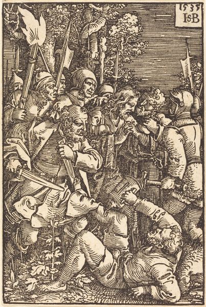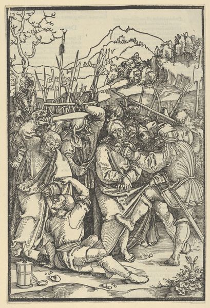 Albrecht Durer created this woodcut, *The Betrayal of Christ*, as part of his *Large Passion* series. The image is formed by carving lines into a block of wood, which is then inked and printed onto paper. Looking closely, we can see how the material and process influence the image. Durer uses the sharp lines to create a dynamic and chaotic scene. The density of the lines and the contrast between black and white gives the print a powerful visual impact. Woodcut printing was a significant medium at this time, as it allowed for the relatively quick reproduction and dissemination of images and ideas. Durer's mastery of the technique allowed him to create complex and detailed compositions, capturing a wide audience. In this particular image, the labor is apparent in the density of the lines, creating a dramatic narrative. Ultimately, this woodcut reminds us that the meaning of an artwork is tied to its material, process, and historical context, challenging us to reconsider the value of craft alongside fine art.