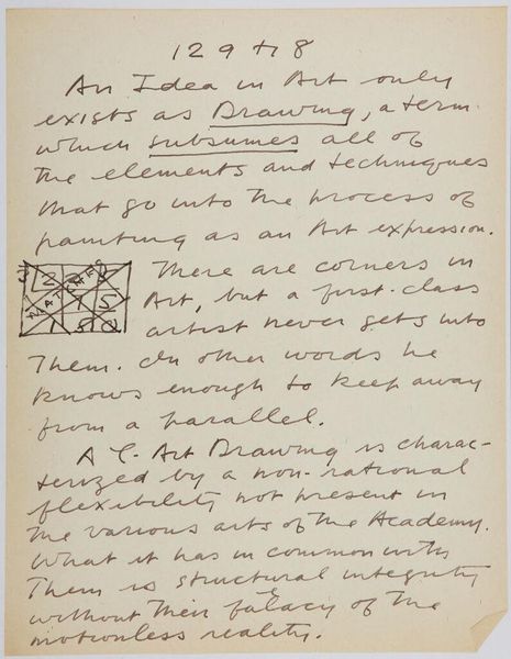 Editor: This is "Art Theory Text with Arc" by Stuart Davis. It's undated, but held at the Harvard Art Museums. It seems to be a handwritten page. What do you see in this piece? Curator: The text presents a theoretical dissection of visual form. Davis seems preoccupied with reducing the complexity of observed reality into elemental components. Notice the emphasis on shape, horizontal-vertical concepts, and "serial fields." Editor: So he's breaking down how we see the world? Curator: Precisely. He's outlining a formalist approach, where the "objective visual elements" of painting are paramount, almost divorced from subjective experience. It reduces art to its most essential structure.