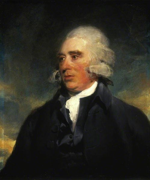 Editor: Here we have Thomas Lawrence’s "George Granville Leveson-Gower", dating back to 1800, rendered in oil paint. What immediately grabs me is the stark contrast between the sitter's pale complexion and the dark, almost brooding background. What do you see in this piece? Curator: Well, you've hit on something vital already. Beyond the obvious elegance of a portrait intended to convey status, for me, the contrast is key, acting almost as a stage. It is where a very self-aware character presents a version of himself to the world. And the year this was painted, 1800, stands on the cusp of great social upheaval. What isn't spoken is often more important, and it hides within the shadows. The texture of his collar and hair speak of the delicate yet potentially transient nature of identity. What feelings does the portrait conjure for you? Editor: I think there is a quiet stillness, as if capturing a fleeting thought. Almost melancholic but restrained. What do you mean by social upheaval? Curator: It's painted on the brink of huge shifts. This man likely holds privilege and title that the coming century will put under tremendous pressure, with the rise of new philosophies. Look at his slightly averted gaze; it’s not defiance, but maybe an acknowledgement that things cannot remain as they were. It also seems like the composition, for all it's finery, has something incomplete in its nature. Something unfinished to represent that very transformation of an era, an expectation of things to come perhaps? Editor: So, the artist captured more than just a likeness, it's a historical snapshot of a moment on the verge of change. The subtle tension in his face is remarkable considering that. Curator: Absolutely! It's a visual poem of a society on the cusp, and isn't it fascinating how a painted gaze can whisper such stories across centuries? A wonderful conversation, really.