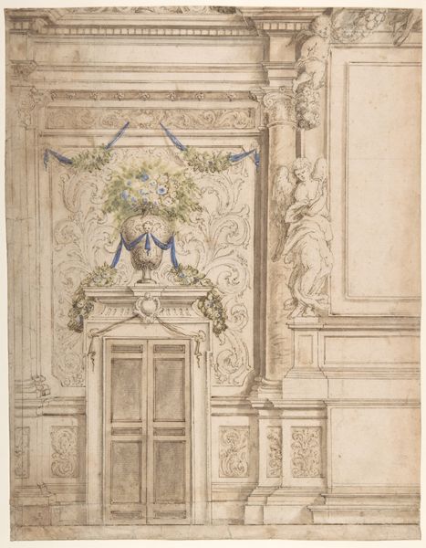 Here we see Jules-Edmond-Charles Lachaise’s design for an altar, rendered in delicate watercolor and pencil. The winged angel looms large, overseeing this sacred space, and this figure is a fascinating convergence of religious and artistic traditions. The angel, a messenger of God, has roots stretching back to ancient winged deities. We see echoes of Nike, the Greek goddess of victory, in its poised stance and outstretched wings. Consider how the angel in Lachaise's design, much like Nike, embodies a divine presence. And look at how the floral ornamentation, spirals and geometric patterns that climb the columns and frame the door, speak to a deep-seated human need for order and beauty in the face of existential uncertainty. These symbols, passed down through generations, tap into our collective unconscious. Lachaise, through his design, evokes a sense of awe and reverence that transcends any one specific religious doctrine. The emotional power of such imagery is undeniable, engaging viewers on a profound, subconscious level. These symbols carry with them the weight of history, memory, and the ever-evolving human experience.
