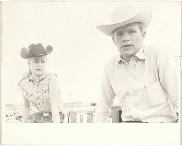 Editor: Here we have Robert Frank's "Two cowboys--Alabama or Tennessee," a gelatin-silver print from 1955. It’s… kind of a hazy image. They almost look like they’re emerging from the fog. It has this very raw, snapshot quality. What stands out to you in this piece? Curator: The haze is key. It’s not just an aesthetic choice. Frank, traveling across America in the mid-50s, wasn’t just documenting; he was critiquing. The soft focus, the seemingly casual composition, they're all deliberate disruptions of the idealized imagery typically associated with the American West. Think about the role of cowboy imagery in projecting American strength and individualism, especially during the Cold War. What is this photograph trying to say about those ideals? Editor: It definitely feels like a subversion. They don’t look like John Wayne. More like ordinary guys. I wonder if that was intentional, considering the social climate. Curator: Exactly! Frank was often drawn to marginalized communities. These cowboys aren’t heroes on horseback. They’re working-class men, their faces showing weariness. Consider the "The Americans" series in its entirety: it challenged the celebratory narratives prevalent in mainstream media. Did Frank see the seeds of discontent simmering beneath the surface of the American Dream? Editor: That makes me think about the role of photography itself. Was he questioning its power to create and perpetuate myths? Curator: Absolutely. By rejecting established photographic conventions, Frank exposed the constructed nature of these images, forcing the viewer to question the narratives they convey. The ambiguity of the title even underscores that point; Alabama or Tennessee? Does it even matter? It's not about a specific place but about a broader social reality. Editor: Wow, I'll never look at a "simple" cowboy picture the same way again! Curator: And that's precisely why art, and understanding its history and context, is so crucial!
