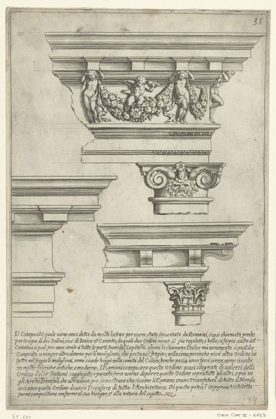 Curator: This meticulous engraving, titled "Toscaans portiek en twee details van hoofdgestel," dates back to 1636. Though the artist remains anonymous, the work is housed here at the Rijksmuseum. Its detailed lines, rendered in ink on paper, present a fascinating study of architectural form. Editor: The precision feels…clinical. It's architectural, certainly, but lacks warmth. Almost sterile in its lines. There is an intention for coldness, that I find a little concerning. Curator: Perhaps “objective” is a better descriptor? The artist isn't trying to evoke emotion, but to demonstrate structure. The meticulous detailing of the Tuscan portico, along with the two capital details, becomes a visual exploration of architectural elements and principles. Notice the rendering of light and shadow; its use constructs depth with careful application to forms. Editor: And what cultural forces might be at play here? It feels deliberately removed from social context. Renaissance ideals often manifested in civic architecture aimed at promoting harmony and the greater good. The writing on the etching suggests more than a simple artistic or architectural treatise. The columns and calculated symmetry are rendered here as part of a deliberate effort of knowledge transfer about civic virtue through public buildings, even in print form. Curator: It does operate as something of a manual. See how each component – the column, the capital, the arch – is dissected and presented almost as isolated units. Editor: Almost as if to dissect the Renaissance preoccupation with balanced harmony to expose its underlying machinery of authority? This could be critiquing power and control embedded in idealized forms, especially considering where this was printed and produced in the 17th century. The austere, technical rendering subverts traditional grandeur, inviting us to question the purpose of design within these societal structures. Curator: A provocative reading! I've always appreciated the clarity with which this artist isolates elements of the Tuscan order, and provides us with what reads to me as a blueprint for classical understanding. Editor: But perhaps we also must think what is it about a society in the 17th century which is so determined to promote its design to such an extreme that the form lacks the life of spontaneity and becomes authoritarian. It's a balance that even a seemingly detached work such as this one hints at the power latent in design, both architecturally and societally.