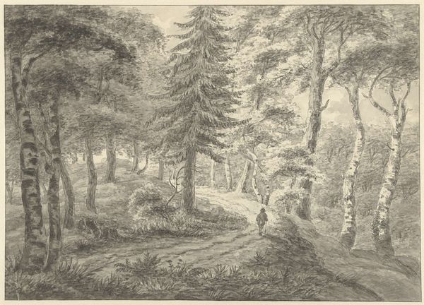 Hermanus Fock created "Bomen aan de Amstelveense Weg" using pen and brush in gray ink, sometime between 1766 and 1822. During this time, the Netherlands was experiencing a period of political and social upheaval, caught between its fading colonial power and the rise of new European orders. Fock, situated within this changing landscape, captures a seemingly serene scene – a path lined with trees. Yet, this pastoral image invites us to consider the relationship between nature and nationhood. During the late 18th and early 19th centuries, landscapes often served as powerful symbols of national identity, subtly reinforcing ideas about belonging and heritage. How might this image reflect or perhaps subtly critique the prevailing social order? Is it an idealized view, or does it hint at the complex and often fraught relationship between the land and its people? Consider the emotional weight carried by seemingly simple scenes, and how they shape our understanding of history, identity, and place.