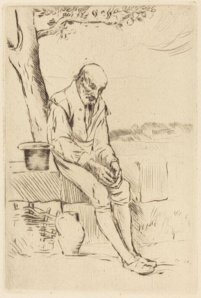 Editor: So, this is "The Smoker," an 1882 engraving by Jozef Israëls. The man is so isolated. I’m struck by the quiet desperation it conveys. What symbols stand out to you in this work? Curator: The pipe itself is a potent symbol, of course. Beyond its literal function, what does it *mean* here, within the context of 19th-century Dutch society? Editor: Hmm. Perhaps a form of escapism or solace? Curator: Exactly. Tobacco often represents contemplation, even a kind of melancholy. But notice *where* he is smoking. It is within the intimate interior of the hearth. How might the open flames impact this setting? Editor: Is the open hearth another layer of meaning? Curator: Yes! Hearth as a sacred, ritual space for reflection. This is where generational memories are formed, stories are told, culture is preserved and handed down, but in this case the mood feels more isolated and forlorn. Observe his placement next to the flames. Are these the passions he still longs to feel, but they remain out of reach? What do *you* sense? Editor: I feel his intense weariness now that you mention it! He’s right beside the hearth, and this shows a link to stories told, but it is inaccessible. Like the figure is separated. It brings such sorrow to the scene. Curator: And this interpretation provides insight to your understanding of the work and to its universal accessibility. We both took meaning and can apply it to any of our understandings of loss. Editor: Seeing how these images can embody those deeply personal experiences. Thank you for unlocking its significance!