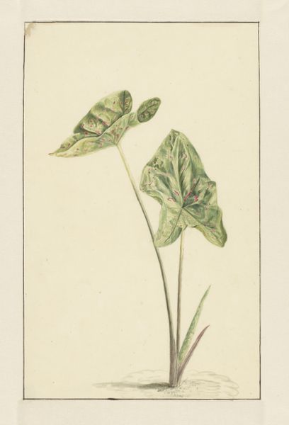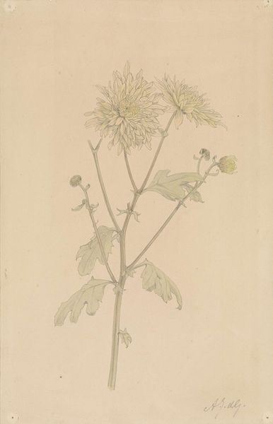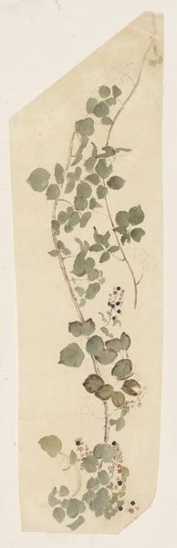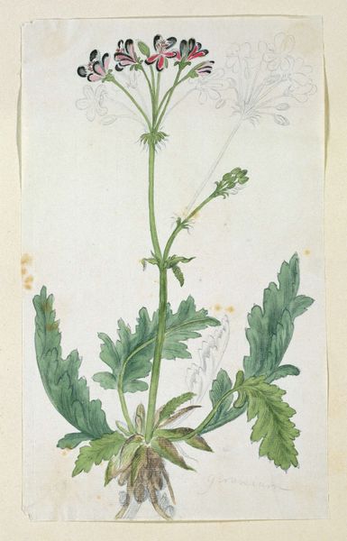 Editor: So, here we have Karel Vitezslav Masek's watercolor and drawing piece, "Botanical-Milt". It has a rather delicate presence, wouldn't you say? What are your initial observations on its visual construction? Curator: Precisely, delicate, yes. I am struck by the structural simplicity—the verticality of the stems anchored by those broad leaves. The color palette is muted, almost monochromatic, focusing our attention on the forms themselves. Consider the composition: the artist emphasizes the tension between open and closed forms. What visual relationships do you find most compelling? Editor: I'm really drawn to how the loose, almost ethereal, quality of the watercolor gives a sort of transient feel to the leaves while also suggesting a scientific sort of analysis with its accuracy. But tell me more about these open and closed forms. Curator: Observe how the tightly closed buds contrast sharply with the more disintegrated, almost skeletal, forms below. Semiotically, this invites reflections upon cycles of growth, decay, potential, and actualization. It's not merely representational, it's deeply involved with process. How does the materiality of the watercolor itself contribute to this reading? Editor: The watercolor’s fluidity mirrors, I suppose, the organic flow of life and its changes that the botanical element conveys... That contrast is very thought provoking! Curator: Exactly. The medium becomes integral to the message, not merely illustrative. We see a dialogue between form and dissolution—a recurring theme when depicting natural elements, yes? What broader theoretical frameworks might inform this interplay between the representational and the abstract inherent in the image? Editor: Wow, I didn’t consider how much could be analyzed with this kind of intense looking. This focus has taught me to read artwork beyond just recognizing its beauty. Curator: Indeed. Shifting our gaze to embrace the formal elements unveils deeper narratives imbedded within the artwork.