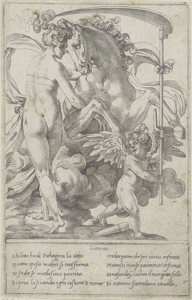 Curator: Let's turn our attention to "Loves of the Gods," an engraving made sometime between 1515 and 1565. This Italian Renaissance intaglio print is currently held here at the Rijksmuseum. What are your immediate impressions? Editor: Stark. Striking contrasts. The figures, the background – everything is so linear. The sharp delineation of light and shadow really directs my eye. The composition almost feels restless, as if the figures are captured mid-motion. Curator: I agree. Understanding its creation helps us delve into those very sensations. Created by Giovanni Jacopo Caraglio, a crucial figure in disseminating Renaissance ideals, the print is based on a drawing by Perino del Vaga. In "Loves of the Gods," Caraglio wasn't merely reproducing an image; he was translating complex ideas about sexuality, power, and the human body into a portable, reproducible form. Editor: So, this is more than just aesthetic exercise. The use of engraving really emphasizes that sense of line I initially felt. Looking at their forms – that idealization, the contrapposto stance. There's a classical root there. Curator: Absolutely. But more than a stylistic quotation, consider what it meant to represent such stories so publicly. The overt display of sensuality and power between the deities… remember the era. What’s considered divine or beautiful then certainly wouldn't be regarded as politically or morally neutral. These prints found themselves in a lot of personal collections where interpretation really started. Editor: So, not only is the artist portraying classical subjects, but he is actively reinterpreting or maybe reclaiming narratives of desire. Are we looking at this portrayal and should we consider who benefits? Curator: Exactly. The figures' vulnerability—exacerbated by the unforgiving linear structure—it also asks critical questions. Questions of agency, spectatorship. Considering whose gaze they were constructed for helps dismantle a myth of objective artistic mastery. Editor: It strikes me how even in a small work on paper, such complex theoretical questions take hold through something as ostensibly basic as a line.