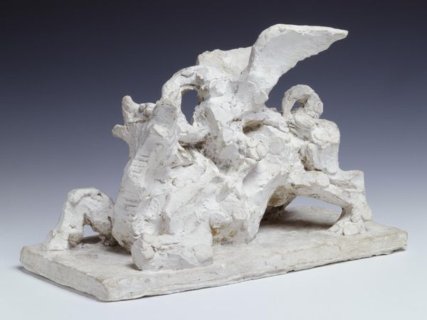 Editor: This captivating artwork, created by Jean-Baptiste (de Jonge) Janelle in 1741, is entitled "Medallion Portrait of a Woman, on Imitation Rock Coral Standard." It's a wooden carving and immediately strikes me as… unexpected. The rough, almost grotesque coral seems an odd setting for such a refined portrait. What formal elements stand out to you in this piece? Curator: The tension you observe is, indeed, intrinsic to the work. Consider the oval medallion itself: a self-contained, formally rigid shape. Now observe how this geometrical constraint is playfully contrasted with the baroque extravagance of the 'coral' stand. Do you notice how Janelle employs textural contrast to further articulate this formal dynamic? Editor: Absolutely. The smooth, polished surface of the woman's portrait against the jagged, porous texture of the coral is very pronounced. Almost like opposing forces. Curator: Precisely. Notice the tonality of the piece; the monochromatic palette forces one to analyze form, texture, and the subtle interplay of light and shadow to glean meaning, absent the distraction of color. Consider how the lines and curves are manipulated in this work. Where does the eye travel, and why? Editor: My eye is definitely drawn to the woman's profile, then downwards along the curve of the coral, ending at the base with all the shells. I suppose because that’s where most of the detailing is concentrated? Curator: Exactly. Detailing contributes to a visual rhythm that emphasizes certain areas over others. Ask yourself: how do these carefully orchestrated visual relationships create a unified aesthetic experience? Editor: This deep dive into form really helps me understand how the contrast in texture and form guides my viewing experience. Curator: By appreciating the interplay between these opposing elements, one unlocks a deeper understanding of its artistic intention, transcending superficial aesthetic appraisal.