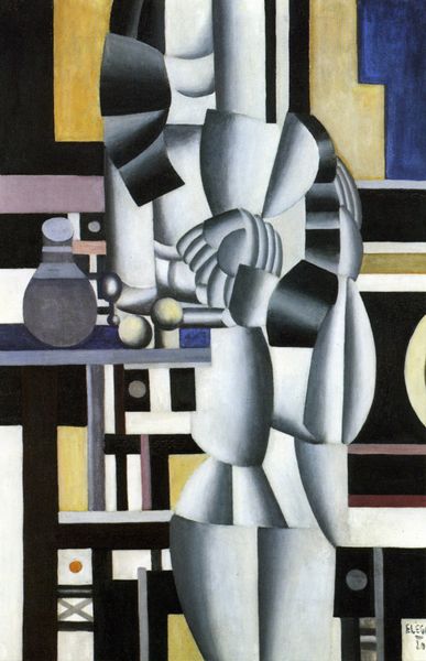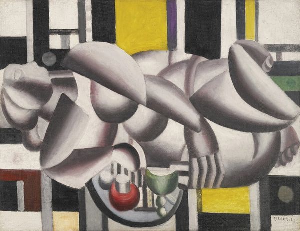 Curator: Standing before us is Fernand Léger’s 1920 painting, "Two Women and Still Life, 1st State," rendered in oil paint. Editor: My initial reaction? It’s like looking at the blueprints of a dream—blocky, bold, yet strangely… vulnerable. It has this machine-age confidence with just the faintest crack showing through. Curator: Absolutely, the composition reflects Léger's fascination with machinery and modern life, aligning with the principles of Cubism, where form is fragmented and reassembled. This interest isn't just aesthetic; it's socio-political. Léger believed that art should reflect the energy and dynamism of the industrial age, becoming accessible and relevant to everyone. Editor: And he presents it through these figures, or fragmented ideas of figures… What's particularly moving is how the abstraction doesn't entirely erase the humanity. There's a definite tenderness in the rendering of the still life objects—a bowl, a goblet, even the simple act of offering. Does that contrast play into Léger's societal ideas, you think? The rigid and organic balancing each other out? Curator: I believe you're onto something. After the trauma of World War I, Léger, like many artists, sought a new visual language to represent a world irrevocably changed. These geometric forms become almost like archetypes. Universal forms freed from specificity to speak to a wider audience, as if rebuilding civilization through simplified design. Editor: That idea of rebuilding rings so true. It’s not just about aesthetics; it’s like Léger's saying, "We can piece ourselves back together, stronger, maybe stranger, but definitely with more intention.” He took a wrecking ball to tradition only to use the pieces to create something both familiar and entirely new. The shapes evoke human figures but are also strangely architectural... a kind of optimistic urban renewal, isn't it? Curator: A very poetic reading! It’s also worthwhile to remember how Léger’s artistic and political stance aimed to position art as an agent of collective empowerment during times of rapid social changes and political polarization. It speaks volumes to this painting's persistent resonance even today. Editor: Ultimately, it feels as though Léger wasn't just painting bodies or objects but presenting us with building blocks. Ideas, perhaps, with which we, too, can reconstruct our perceptions and understanding of the world. A daunting, exciting invitation.