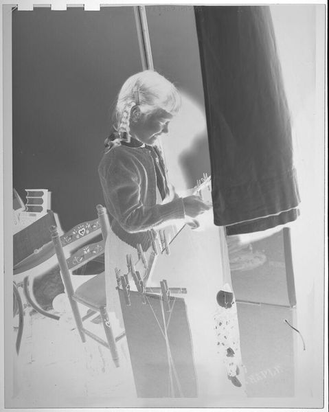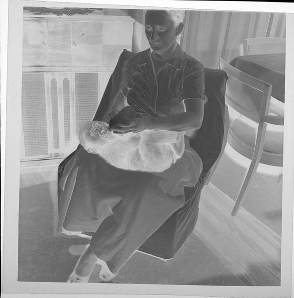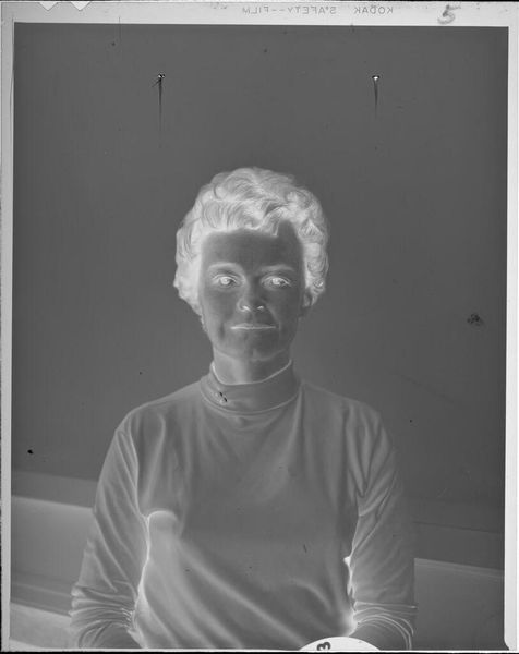 Editor: This is an intriguing black and white photograph, Untitled (seated boy wearing glasses), by Lucian and Mary Brown. The stark contrast really emphasizes the texture of the curtain behind him. How do you interpret the materiality of this image? Curator: For me, it's all about the film. The photographic negative itself becomes a material object, revealing the chemical processes and labor involved in its production. What social context can you glean from the boy's presentation? Editor: His clothing and glasses feel very specific to a time period. Could the choice of Kodak film itself be a commentary on mass production and accessible art? Curator: Precisely! Examining the materials chosen allows us to question the value assigned to the image and challenges traditional notions of artistic creation. Editor: It’s fascinating how focusing on the physical aspects opens up these broader ideas!
