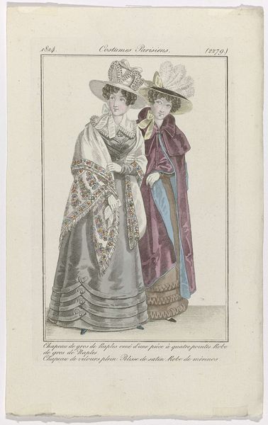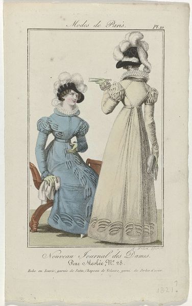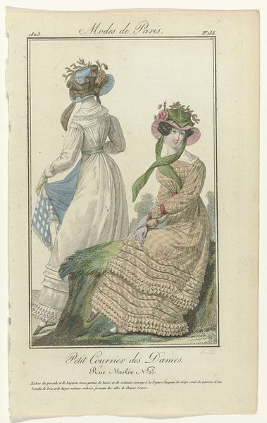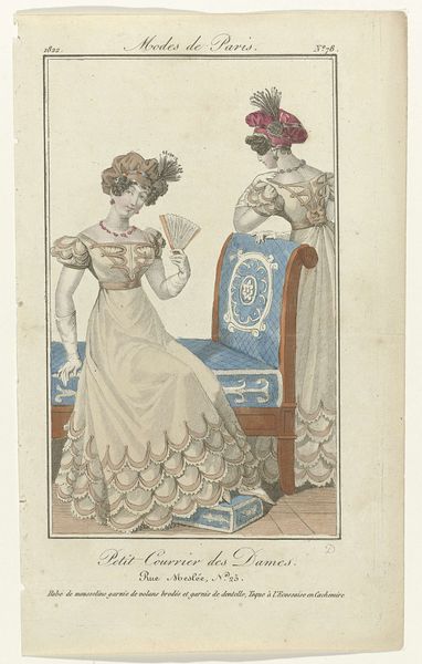 Curator: This print, "Petit Courrier des Dames, 1823, No. 116" from an anonymous artist, showcases early 19th-century fashion. Etched lines filled with delicate color…what immediately strikes you? Editor: Well, the detail on the dresses is pretty remarkable, especially considering it's a print. I’m curious about the amount of labor that went into creating those lace details and embellishments, both in reality and in representing it in this medium. Curator: Precisely. Look at how the print functions as a record, almost an advertisement, of the incredible textile production of the era. Think of the workshops and the people involved. Editor: So, it’s less about artistic expression and more about the display of available commodities? Curator: It is both. The etching and the color contribute to the allure, enticing the consumer. The “Petit Courrier des Dames” served a real purpose. Did these prints celebrate artistry or promote consumption? Editor: Possibly both, simultaneously. The skill in rendering the fabrics elevates it beyond a simple catalog, but its primary function was commercial. The contrast between the delicate aesthetic and the labor involved is interesting. Curator: Think of the materiality here. Paper, ink, dyes, the fabrics themselves… Consumption then had tangible form in everyday life. Editor: That makes me consider how our perception of fashion images may change by just thinking about its context. Thank you. Curator: It's a dialogue between the creation, consumption and circulation that’s vital to understand these works beyond their immediate aesthetic appeal.