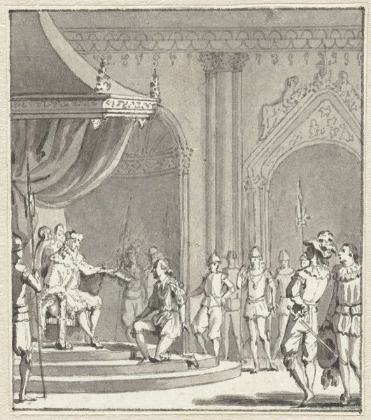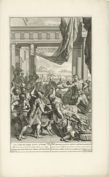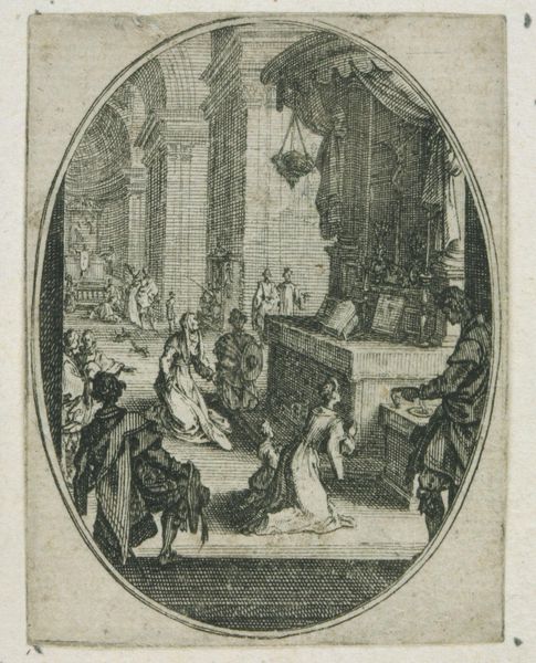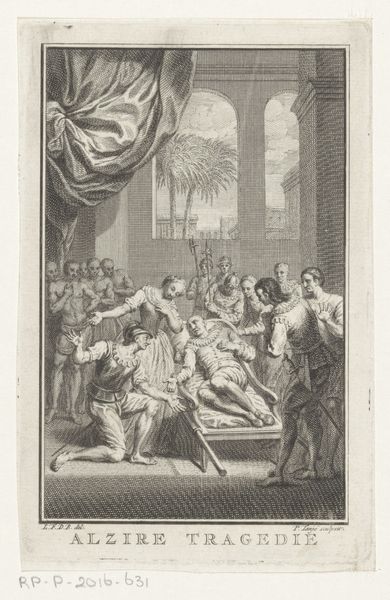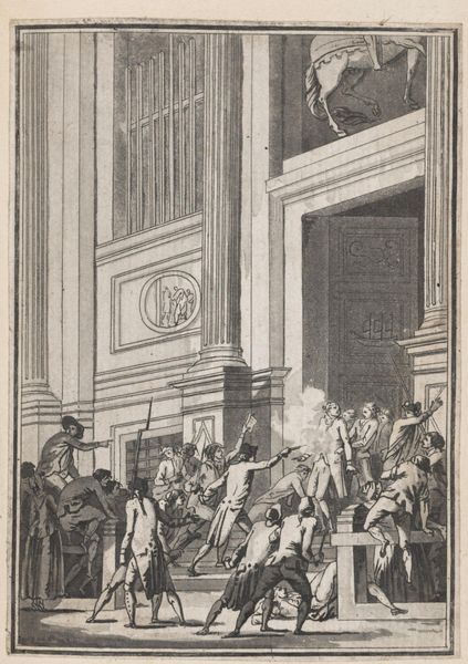 Curator: This engraving by Jean François Janinet captures a tumultuous scene: "In the Courtyard of the Hôtel de Ville, the Women Try to Hang the Abbé Lefevre, and the Men Begin to Burn Papers (5 October 1789)". It’s a compact work, only 13 by 9 centimeters. Editor: The immediate impression is chaos, all frantic energy swirling around a central, brutal act. You can almost feel the tension of the moment rendered in stark monochrome. Curator: Janinet, born in 1752, was documenting a pivotal moment, reflecting the intense social and political upheaval of the French Revolution. The act of burning papers signifies a rejection of the old order, literally dismantling the documents of power. Editor: And the women's actions, the attempted hanging, speak volumes about gendered roles in revolutionary violence. The image powerfully depicts the rage and desperation fueling such actions, hinting at intersectional struggles within the broader revolution. Curator: Considering the scale and the medium, Janinet’s engraving acted as a means of disseminating revolutionary ideals across the French population through accessible prints. Its materiality offered a tangible form to these complex themes. Editor: Absolutely, and thinking about the scene itself, it makes me reflect on how revolutions often consume their own. It prompts questions about who gets to control the narrative and who bears the brunt of revolutionary fervor. Curator: I find myself pondering the way printmaking democratized art consumption, enabling broader participation in revolutionary ideologies. Editor: And I see how the echoes of those tensions still resonate in our contemporary discussions about power, gender, and social justice.