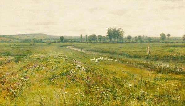 Egbert Rubertus Derk Schaap made this oil on canvas painting, Meadow in Bloom. It’s all about how individual marks come together to create a whole, like each dab of paint is a tiny flower contributing to the overall field. Looking closely, you can see how Schaap built up the texture with short, broken strokes of paint. The colors are muted, mostly greens and yellows, creating a hazy, dreamlike atmosphere. It feels like you could reach out and touch the soft, swaying grass. The way he layers the paint, it’s like he's trying to capture not just what a meadow looks like, but what it feels like to be in one. If you squint you will see that it has a lot in common with the impressionist landscapes of Alfred Sisley. Both artists shared a concern with capturing the fleeting effects of light and atmosphere, a sense of transience that reminds us that art, like life, is always in flux.