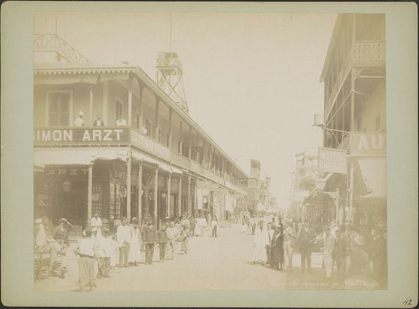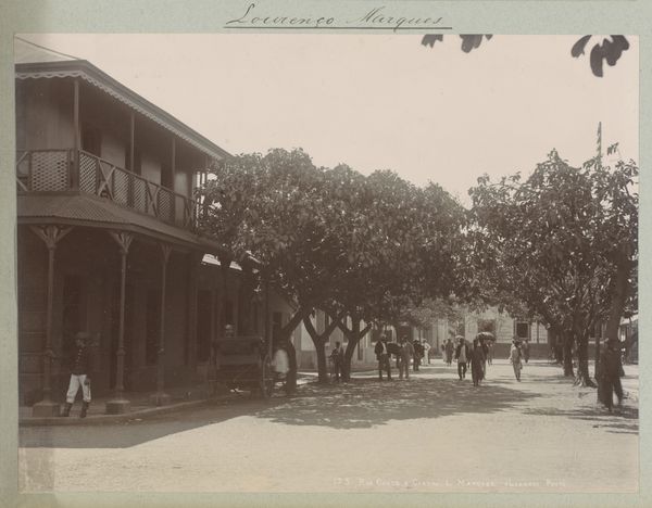 Curator: Looking at this gelatin-silver print, what strikes you most about it at first glance? Editor: A certain placidity. Despite the presence of figures, there's an almost palpable stillness, enhanced by the monochromatic palette. It feels quite formally composed. Curator: Indeed. What we have here is a photograph titled "Gravenstraat in Paramaribo," taken sometime between 1900 and 1910, from the collection of the Rijksmuseum. The artist remains, for now, unknown. Editor: The composition definitely guides the eye. That building on the left, with its ornate, two-tiered balcony, anchors the image. Then the line of trees pulls you toward the horizon. Curator: It presents a specific colonial architectural style. The overhanging balconies aren't merely decorative; they are a response to the climate. They cast shadows and help modulate sunlight, creating zones of interaction. These are essentially public, yet semi-private spaces. Editor: Good point. And the figures… their small scale against the backdrop of architecture and nature emphasizes a kind of human insignificance, doesn't it? There’s a relationship here, too. They seem suspended between progress and nature, history and potential. Curator: Precisely! Photography in this era often served a documentarian role. It’s capturing the evolution and the representation of Suriname, then a Dutch colony, negotiating its identity at the intersection of European and indigenous cultures. These photographs shaped perceptions and informed narratives that were often constructed by the colonizers. Editor: Considering those power dynamics adds a vital layer. This isn't simply a picturesque cityscape; it’s a visual artifact embedded within a history of imperialism and its effects. A careful formalism is always the best way of viewing art through structure and engagement with color. Curator: Agreed. Understanding this, the image offers a profound commentary, one that encourages reflection. I hope those visiting take note that these works are only through visual and historical frameworks and social environments. Editor: Absolutely, both artistically compelling and rich with historical depth. It makes one consider how spaces are not neutral, but carry their time's values and the echoes of the past into the present.