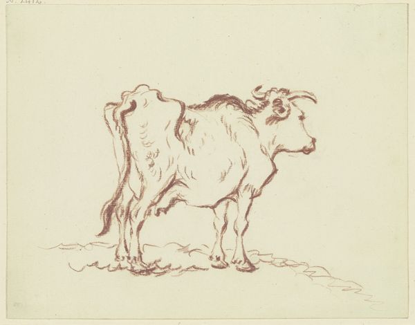 Editor: This drawing, "Standing Ox Facing Left, Seen From Behind in Slight Foreshortening," is by Friedrich Wilhelm Hirt, who lived in the 1700s, I believe. It's done in pencil and chalk. I find it so simple and straightforward, almost…stark. What stands out to you about it? Curator: Immediately, I'm drawn to the symbolic weight an ox carries across cultures. Think of its association with strength, labor, but also sacrifice in ancient rituals. Does the foreshortening suggest anything to you about our relationship to this animal – a distance, perhaps? Editor: Maybe… it's almost like we're meant to observe it working, or just existing in the field from afar. The averted gaze enhances that. I'm curious about your thoughts on animal representation then, and now? Curator: Yes, and in many mythologies, cattle were often associated with deities, fertility, or even the origin of the cosmos. Artists would study nature directly but infuse the natural form with symbolic weight. I would wager this isn't a photorealistic capture of a beast of burden but rather, one charged with cultural memory. Editor: It is interesting that such a simple drawing holds such powerful cultural baggage. The image feels incredibly direct, almost documentary, but your interpretations suggest there's so much more depth to it. Curator: Indeed. Think how pastoral landscapes themselves have functioned in art history to evoke nostalgia for a simpler life, or idealized notions of the natural world. And it all comes back to this ox. It serves as a constant visual symbol, reminding us that these landscapes and the animals represent specific belief systems. Editor: That is a point well taken. Thank you. I will reflect more on the connection between landscape and beliefs represented within. Curator: The pleasure was all mine.