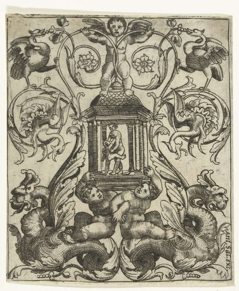 This print, made by an anonymous artist, presents a composition densely packed with figures and ornate foliage, rendered in meticulous detail. The stark contrast between the delicate lines of the engraving and the robust forms of the figures evokes a dynamic tension, drawing the eye across the image. The composition is structured by a visual hierarchy, where the eye moves from the elaborate swirls of leaves at the top to the chaotic scene below. Here, satyrs and children grapple with a dragon, creating a vortex of intertwined bodies and limbs. This blending of the grotesque and the playful undermines a clear narrative, instead highlighting the piece's structural complexities. The use of line becomes a crucial element in understanding the work’s semiotic framework. Each stroke contributes to the overall texture, imbuing the scene with a tactile quality that invites closer inspection. This piece challenges fixed meanings, inviting viewers to engage in an ongoing interpretation of its rich visual language.