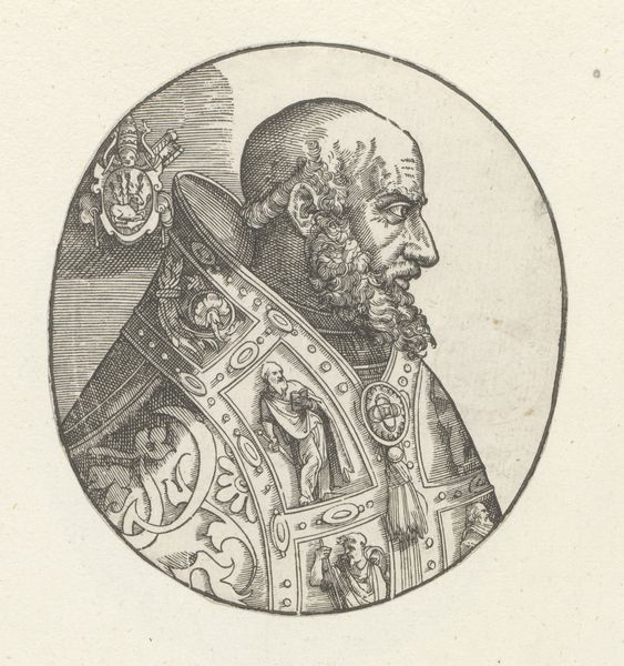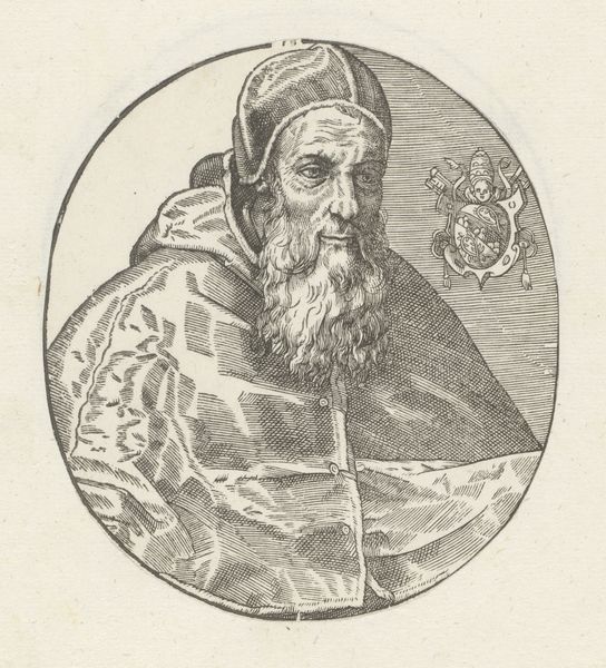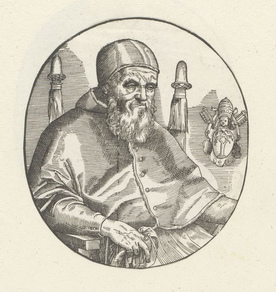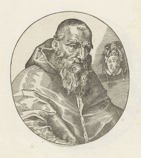 This is an anonymous engraving portraying Pope Pius V. Though undated, it reflects the period of the Counter-Reformation, a time of intense religious and political upheaval in Europe. Pius V, who reigned in the 16th century, was a central figure in this movement, known for his strict adherence to Catholic doctrine. His papacy was marked by efforts to reform the Church, suppress heresy, and centralize papal authority. The engraving captures Pius V in a moment of devout prayer, reinforcing his image as a stern, ascetic figure dedicated to his religious duties. The inclusion of his coat of arms further emphasizes his authority and the power of the papacy. Consider how portraits like this one played a crucial role in shaping perceptions of religious and political figures. Rather than offering a glimpse into the individual, they were designed to project a specific image of power, piety, and legitimacy.