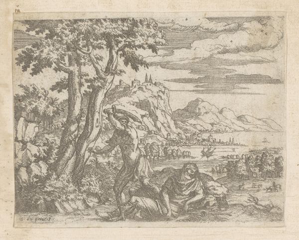 Curator: This is "The Beach with the Large Tower" an etching on paper by Claude-Joseph Vernet, dating from around 1734 to 1752. Editor: My first impression is of organized chaos; there's a meticulousness to the lines, but it depicts a bustling scene of everyday life by the sea. Curator: Yes, and Vernet was quite preoccupied with these depictions of daily life and labor. This particular work presents a landscape inhabited by working-class people engaged in various activities: fishing, tending to boats, simply existing. The tools they use, their garments—all speak to their roles in a specific coastal economy. Editor: The composition certainly leads the eye deliberately. From the lower left, where the figures are most active, towards the grand tower and the elevated architectural landscape on the right. The sharp contrast of light and shadow creates a beautiful depth that underscores the scene’s dynamism. Curator: Absolutely. It is indicative of Vernet's involvement with the materiality of the era. Consider the paper itself, likely produced in a specific region with its own production processes. The etching technique allows for mass production, which speaks to a broadening audience for art and landscape imagery at the time. This democratizing effect—the move away from exclusive commissions toward wider distribution—is something I think worth emphasizing. Editor: That is undeniable. However, I still see its elegance primarily rooted in formal qualities. The carefully calibrated arrangement of shapes, the textural variety achieved through etching... Even within a repeatable medium, there's incredible sophistication in its visual language. The way the lines dance across the paper. Curator: And how does that interplay manifest socially, considering these etchings made art more accessible, influencing tastes and aesthetics within burgeoning middle classes? The availability of prints allowed broader populations to consume images of ideal landscapes, indirectly affecting real-world environments and design preferences. Editor: A valid point, although one could argue that the inherent beauty in this work transcends its accessibility. It's a balanced conversation between line and form. Its elegant design elements stand firmly by themselves. Curator: Still, seeing those fishermen—it's crucial we ask, "Who has access to art? What are their tools, both figuratively and literally?” Editor: Well, I’ve certainly reconsidered how line weight conveys spatial depth today, whereas my friend here made me remember its historical distribution network. Thank you.