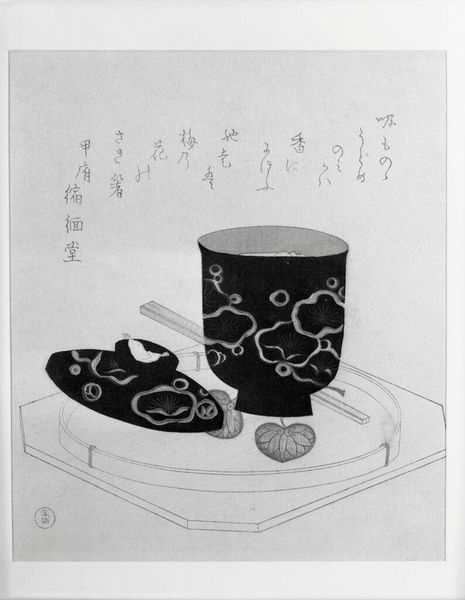 Editor: Here we have "Hair Ornaments" by Hidenobu, housed at the Harvard Art Museums. It's a striking image, almost like a still life but with such delicate lines. What do you make of it? Curator: Well, isn't it charming? It whispers of everyday elegance, don't you think? It’s as if the artist has captured a fleeting moment of beauty, the meticulous arrangement a testament to the care lavished on personal adornment. The text itself hints at a poetic sensibility. Do you see the interplay between the objects and the calligraphy? Editor: Now that you mention it, I do. Thanks! Curator: My pleasure! Hopefully you’ll never look at an image the same way again!
