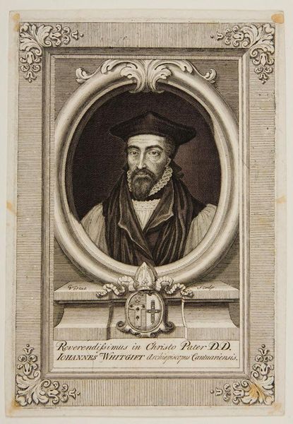 Editor: So, this is "Edmund Grindall" by George Vertue, an engraving. It feels so formal and posed, with that ornate frame. How do you interpret this work, Professor? Curator: It's a fascinating piece! Vertue had a real knack for capturing the gravitas of his subjects. I see a deliberate attempt to portray Grindall, the Archbishop of Canterbury, as a pillar of the church. What do you make of the inscription? Does it give you any further clues? Editor: It emphasizes his religious title, but it doesn't give me much insight beyond that. Curator: Exactly, it further reinforces Grindal's authority. Think about the time period—how did they want to be seen? It's a carefully crafted image meant to project power and piety. Editor: I see. So, it's less about Grindall as a person and more about the image he wanted to project. Curator: Precisely! And Vertue, ever the craftsman, delivered. Food for thought, eh? Editor: Definitely something to consider! Thanks for that insight.