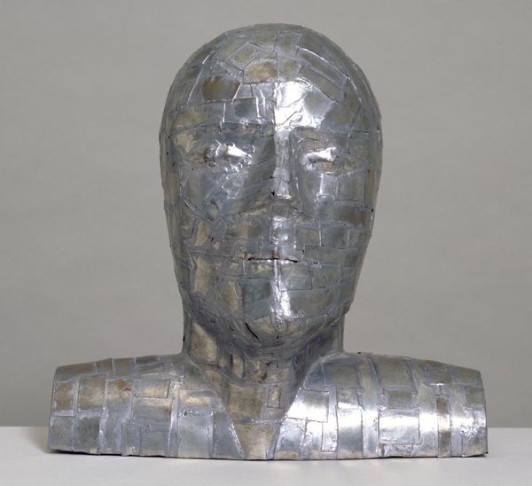 Editor: This bronze sculpture is Dame Elisabeth Frink's "Goggle Head". The metallic sheen and impersonal goggle-like eyewear give it a detached, almost authoritarian feel. How do you interpret the social commentary within this piece? Curator: Considering Frink's era, and the socio-political anxieties of the Cold War, this head reflects institutional power. The goggles obscure individuality, suggesting a surveillance state. What does the scale of the piece communicate to you? Editor: That it is meant to be imposing and to command space. Curator: Exactly! Its presence in a public space could then be seen as a commentary on the ever-present gaze of authority. Editor: That’s a perspective I hadn’t considered. Thanks! Curator: You're welcome. It's always about questioning whose gaze is reflected and amplified by art institutions.
