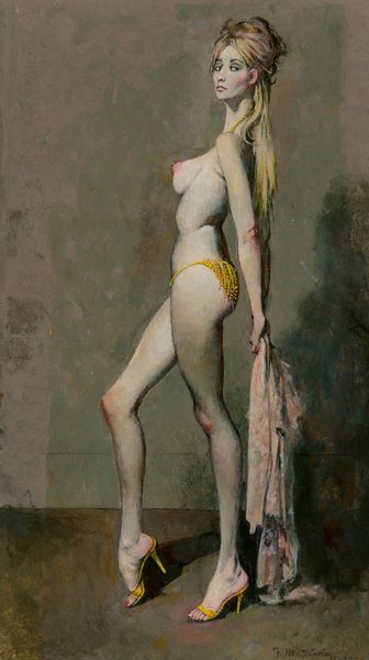 Editor: We're looking at "Natalie" from 2015 by Robert McGinnis, an oil painting. It strikes me as intentionally classic, like a modern take on an odalisque, but… the shoes feel contemporary. What do you see in it? Curator: Well, I immediately see a dialogue being set up between traditional oil painting techniques, readily associated with a certain level of ‘high art’, and this almost commercial, pin-up sensibility. How are traditional materials employed here to either reinforce or subvert existing structures within the art world? Editor: So, the *process* of using oil paint is significant here? Is it about the tension between a classical technique and a potentially "lower" subject? Curator: Precisely. The medium carries its own baggage. Oil paint traditionally allowed for precise rendering, as seen here. Yet, consider the background. That hazy green. Is that laziness, cost-cutting, or a deliberate decision to juxtapose highly refined technique with something more ambiguous, perhaps referencing mass production techniques? What’s being revealed about labor itself? Editor: I hadn't thought about that contrast within the *same* work. So, we're meant to consider *why* these materials were used in this specific way? And also the economic conditions of making this art, to better understand it? Curator: Exactly! The oil paint itself becomes an active participant in the reading of the image, not just a passive carrier of the image itself. Think about where the paints originate and the cost. All choices influence meaning. Editor: I never thought about it like that, about reading materials themselves for clues. That definitely gives me a lot to think about when looking at paintings. Curator: Indeed. It compels us to really question the layers of production at work, complicating what might initially appear as simply a classically rendered portrait.