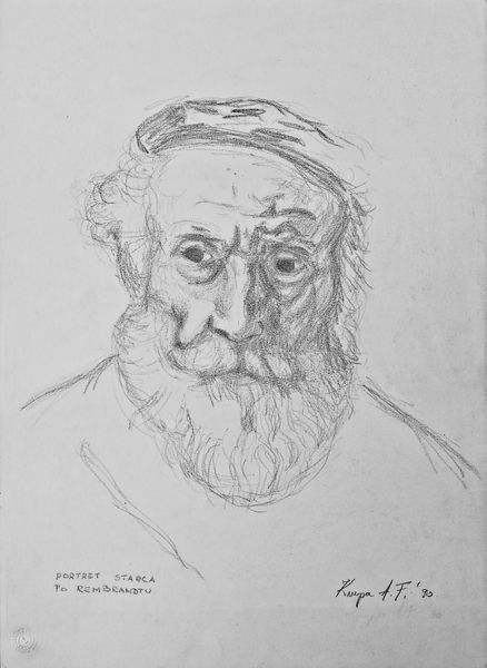 Curator: Orest Kiprensky’s pencil drawing, "The Old Man’s Head," from 1807 offers a striking image. There's something quite captivating in its stark simplicity. Editor: Yes, I am struck by its quiet intensity and frankly its poignancy. He looks…burdened. The heavy shadows definitely contribute to that impression. Curator: Absolutely, it's the masterful manipulation of the pencil that commands our attention. The raw texture of the paper interacts with the graphite creating a tangible presence. Considering it as a work on paper also informs a view of production costs and studio work during the time period. Editor: Looking closer, it’s not just about skill but a statement regarding access and visibility. Who were portraits typically reserved for at the time, and who did Kiprensky choose to elevate? This portrait challenges the conventional norms by celebrating lived experience beyond social status, suggesting beauty lies in the individual’s depth and character. The fact that the piece focuses on a male is curious, do other images of the time show such unromantic perspectives on gender, masculinity, and ageing? Curator: The medium and the romantic style really underline these ideas. Kiprensky's method isn't polished—we see the process of drawing itself. And speaking of materiality, think about where the artist might have sourced such materials in the early 19th century; was there a burgeoning market for art supplies, even then? Editor: Exactly! Moreover, his decision is especially powerful, prompting us to ask important questions about who society chooses to valorize. This is also evident through the lens of romanticism – an interest in emotion but also disruption and unconventional figures. I wonder, how does this disrupt ideas and definitions of identity? Does that shift based on historical norms? Curator: Such nuanced readings open our eyes not just to the subject, but also to the socio-economic conditions of art production. Kiprensky is not simply making art; he’s part of a material chain. Editor: Indeed. It highlights how artists shape our perspectives and disrupt narratives – both in their choice of subject matter and in how their work encourages dialogue. "The Old Man’s Head" invites us to see beyond the surface and to find meaning and beauty where we might least expect it.