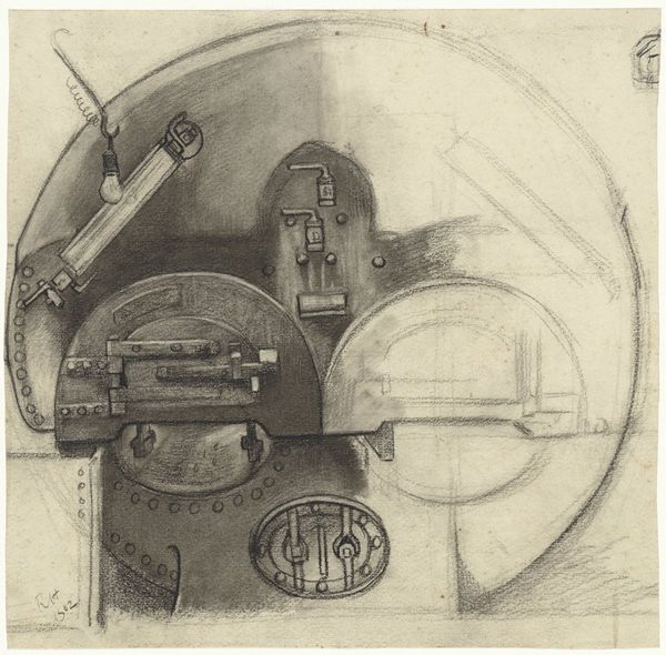 Curator: I find the starkness of this vintage image compelling. The composition focuses on hard lines and textures, creating a sense of precision. Editor: Sir Eduardo Paolozzi created this untitled print, "Decompression Pair," as part of his "Pages from the Aerospace Medical Library" series. Paolozzi's work often explores the intersection of humanity and technology. Curator: Given the context, the technical schematics become profoundly unsettling. It's about the body subjected to extreme conditions. Editor: Absolutely. This highlights the post-war era's fascination with scientific advancement and its potential impact on the human form. Curator: I see Paolozzi critiquing that detachment. Editor: The visual language is clearly informed by machinery, yet the anatomical diagram underscores vulnerability. The human form is reduced to data. Curator: A powerful reminder of the human cost of exploration and the relentless march of progress. Editor: Indeed, it prompts consideration of whose bodies are rendered expendable in service of progress.