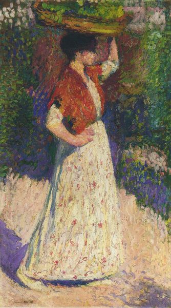 Curator: Richard Gerstl’s “Portrait of Henryka Cohn,” painted in 1908, currently resides here at the Leopold Museum. Editor: What immediately strikes me is the intense contrast—that stark white dress against the almost violent red and orange of the sofa. It creates an immediate sense of unease. Curator: Interesting. The subject's dress, made using broad strokes of oil paint, contrasts dramatically with the highly textured surface of the sofa, a clash typical of early Expressionist explorations of the human form within artificial interior space. Look closely and you'll find that this painting also deviates from academic norms as Gerstl applied paint very gesturally; at times even scraping it. This creates the image's unsettling mood. Editor: Yes, the surface is so active! This "roughness" seems crucial, suggesting more than simple portraiture, moving, rather, towards representing interior psychological states, beyond only appearances. The brushwork, almost aggressively expressive, builds volume and presence. Note too how the color fields create almost a semiotic pattern for interpreting affect within social classes, almost as if signaling revolt. Curator: Exactly! Cohn, being part of a wealthy family, could access these avant-garde styles. The social context of such experimentation cannot be ignored; artists like Gerstl pushed boundaries that relied on existing economic structures. Henryka was also Arnold Schoenberg's wife's sister! This work then becomes not merely an image, but a cultural artifact intertwined with music and society's intellectual elite. Editor: Yes, by focusing solely on structure, line and palette, one might fail to acknowledge how integral production means were as both cause and effect with his Neo-Expressionist style! In short, its formal properties gain added depth through considering production and networks of material support within social milieu. Curator: Absolutely! By combining insights from materiality and the language of form, one discovers the multifaceted depth imbued within "Portrait of Henryka Cohn," where both paint and context powerfully engage with both eyes and mind. Editor: Indeed. It leaves you considering art history more completely; beyond its appearance—to also examine materials' very substance and life cycles.