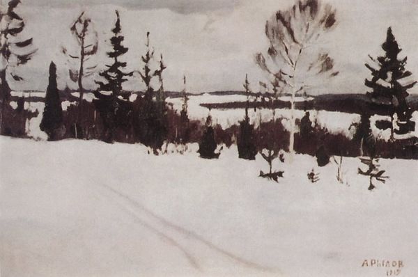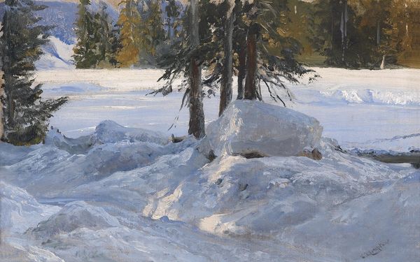 Editor: We’re looking at Eero Järnefelt’s "Kevättalven Aurinko," an oil painting done en plein-air depicting a snowy landscape. It has a serene and somewhat melancholic feel. What strikes you about this work? Curator: The landscape, particularly in the context of Finnish art around the turn of the century, often functioned as a powerful signifier of national identity and resilience. How does Järnefelt engage with or perhaps challenge this notion here? The focus on a moment of transition – "Kevättalven Aurinko" translating roughly to "Spring-Winter Sun" – feels crucial. Editor: I see the transition now. The title suggests a shift, not just winter, and the light does have a hopeful quality breaking through the snow. But what about the darker shades in the forest in the background? Curator: Exactly. Think about what the persistence of winter, despite the sun’s promise, might symbolize. The Finnish people had their own long winter of Russian oppression. Is Järnefelt subtly hinting at that ongoing struggle for autonomy and self-determination through this landscape? The style is so subtle that perhaps he aimed to create universal message through unique perspective in natural environment. Editor: That context makes the painting far more potent than just a pretty winter scene. So, nature isn't just nature here; it's a coded space reflecting socio-political realities? Curator: Precisely. The quiet beauty can also be interpreted as an act of resistance, a celebration of Finnish identity during times of adversity, and finding strength from the place. What do you think, do these circumstances impact modern readings of the work? Editor: Definitely! Knowing the historical context enriches the emotional experience and prompts us to look beyond the surface. I guess I’ve learned to never assume a landscape is *just* a landscape! Curator: Agreed. And consider how movements within the natural world echo human struggles, both on micro and macro level, which adds complexity and depth.