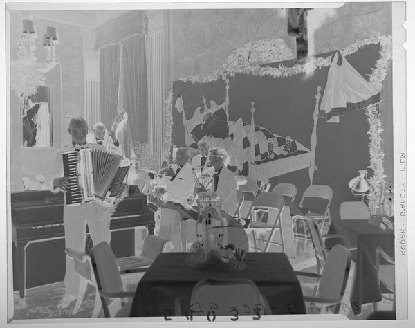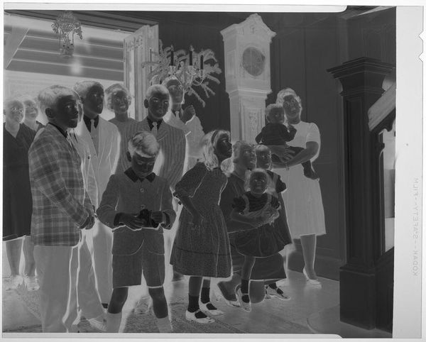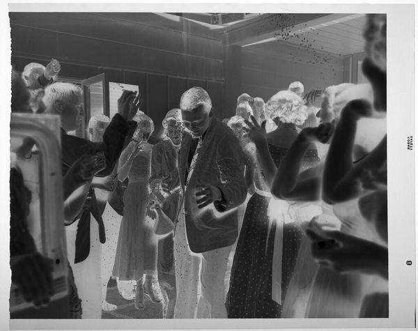 Editor: Here we have an untitled photograph by Jack Gould, showing a close-up of a woman at a party. The image is grainy, almost like a film still. What social dynamics or material conditions do you think are at play here? Curator: Let's consider the cocktails and the table, mass-produced objects implying a specific culture of leisure and consumption. How does Gould's photographic process—the choice of film, the exposure—contribute to our understanding of this social scene and its participants? Editor: That's interesting. It makes me think about the role of photography itself as a tool for documenting and constructing social narratives. Curator: Precisely. By examining the materials and methods, we can uncover the relationships between representation, materiality, and social class.