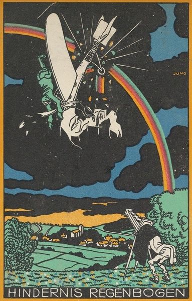 Curator: Oh, there's such an uncanny quality to the forms within William Wallace Denslow's, *The Monkeys caught Dorothy in their arms and flew away with her.* This illustrative plate dates to 1900. What's your immediate impression? Editor: The whimsical absurdity of it all strikes me first. These creatures, a band of winged monkeys, abduct Dorothy and the Tin Man mid-air! One gets a very dark and absurd tone to it all. Curator: Indeed. Observe the deliberate distortion of the monkey’s faces, almost grotesque, against the saccharine portrayal of Dorothy. There's an interesting tension in how Denslow employs caricature. Editor: Well, in that period, illustrated books for children were certainly tools to perpetuate the colonial narratives, so one has to wonder how innocent the artist remained. I would note the social dimensions to Denslow's aesthetics; even though the subject has the air of fantasy, such representations weren't exempt from political discourse. Curator: Yes, I follow. Yet, if we center instead on the formal properties of the work, we can observe how skillfully Denslow juxtaposes flatness with a kind of imagined depth, using line and color. Notice that delicate, almost ukiyo-e aesthetic. The picture plane is organized meticulously, directing the eye along these lines of flight. Editor: Precisely, and there, that visual lightness underscores the troubling narratives, how something disturbing can easily cloak itself under playful veneer. The popularity of the "Wizard of Oz," from Baum’s book to the MGM adaptation, made certain stories into public events, framing much of America's relationship to the idea of otherness at the time. Curator: Perhaps you are right. Even so, the efficiency and execution of Denslow's visual strategies deserves acknowledgement; it achieves its peculiar emotional effect so deliberately. I see it primarily as an effective application of artifice. Editor: No question it possesses artistic qualities. To study this through history is to accept there is always context, not just a surface but how the narrative participates in culture. Curator: Well said.