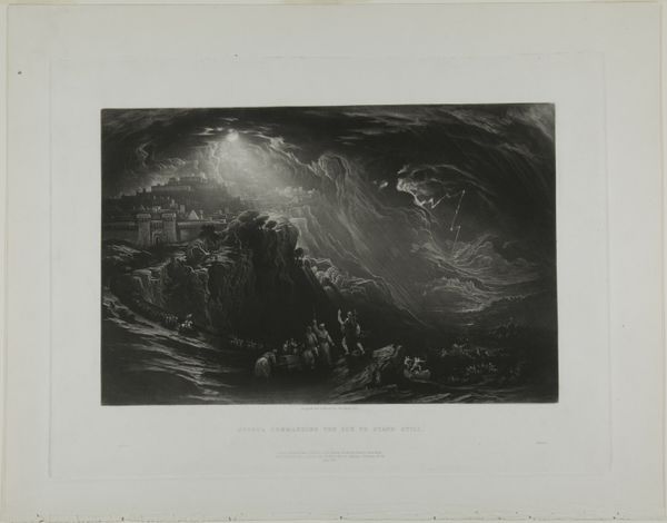 Curator: Here we have John Martin's "The Deluge, from Illustrations of the Bible," created in 1831, employing engraving on paper. It’s currently held at the Art Institute of Chicago. Editor: My initial reaction? Overwhelming. A churning mass of bodies, water, and rock. There's a sense of utter chaos and despair conveyed through the intense contrast of light and shadow. Curator: The depiction of this biblical event offers fertile ground for examining themes of divine retribution and human suffering. How does it speak to the historical context of the early 19th century? This period was marked by immense social change and upheaval and was also informed by religious revivalism, but perhaps more interesting than religious belief alone is this artist's sense of visual theater and spectacle. Editor: Absolutely. Considering the print medium itself, the accessibility would have enabled a wide audience to grapple with themes of class division and labor inherent to catastrophic events. I am thinking that an interpretation rooted in materiality considers who would have engaged with it in the wake of new technologies and who could have consumed images in relation to other objects within the Victorian home. Curator: Martin's portrayal also intersects with prevalent discourses on gender and power, evidenced in the distressed figures and the romanticized ideal of masculine strength amidst destruction. What sociopolitical narratives can we extract from the ways that human figures navigate it? Editor: Focusing on process, observe the artist's technical mastery. Engraving requires rigorous and dedicated skill. Its creation involves meticulous planning, time-intensive labor, and specific tools. Curator: This highlights a narrative around industrial progress, yet it seems deeply ambivalent about its impact on both individuals and society, pointing towards issues that are very resonant now such as disaster capitalism, or the environmental cost of capitalism and colonialism. Editor: I appreciate that. We shouldn’t forget how the production conditions and artistic skill merge with Martin's grand vision. It brings forth questions about artistic labor as social critique. Curator: Ultimately, John Martin invites us to question the established norms, inviting reflection on collective identity. Editor: Exactly, acknowledging artistic techniques alongside its reception in society, brings richer appreciation to this engraving.