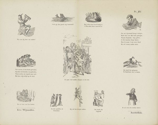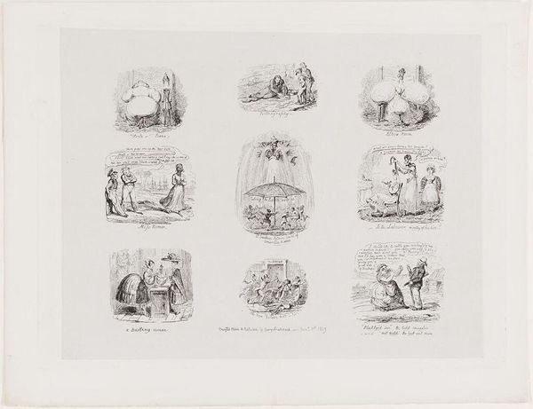 This monochrome print presents six distinct vignettes arranged in a grid. The scenes, rendered with sharp lines and contrasts, evoke a sense of narrative, though the precise stories remain elusive. Powney’s organization of these framed images creates a structural interplay between the individual scenes and the whole. The use of symmetry in the composition, juxtaposed with the varied content of each frame, establishes a visual rhythm that invites interpretation. One could interpret the grid itself as a framework, imposing order on the chaotic possibilities of storytelling. The absence of color focuses attention on the stark contrasts and the detailed line work, emphasizing form and texture. This deliberate limitation may serve to highlight the underlying structure of the narratives or to invite a deeper reflection on the nature of representation itself. The work destabilizes fixed meanings, offering instead a space for the viewer to construct their own connections.