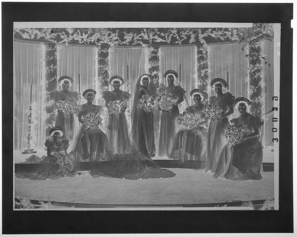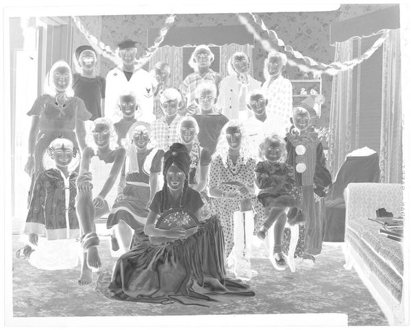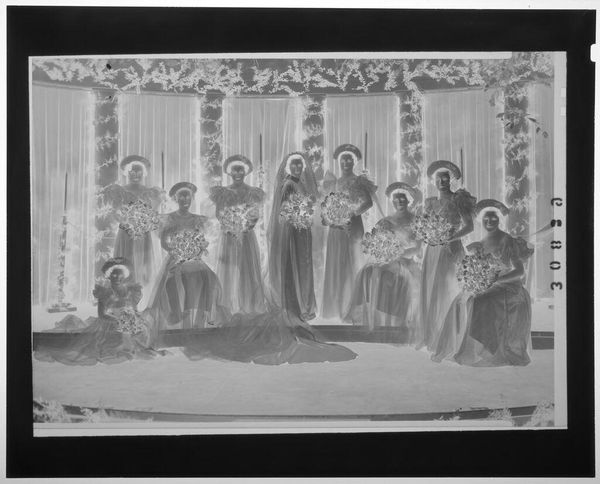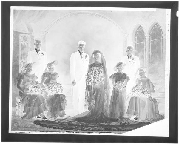 Editor: Here we have an untitled photograph by Martin Schweig, a large family portrait. It's striking how the composition is arranged. What structural elements jump out to you? Curator: The stark contrast immediately captures attention. Note the careful arrangement of figures, a deliberate orchestration of light and shadow which directs the viewer's gaze. The subjects are strategically placed in a hierarchy. What does that arrangement suggest to you? Editor: Perhaps a sense of order? The repetition of formal attire also strikes me. Curator: Precisely. The photograph's formal qualities speak to a constructed reality, a presentation of societal expectations and family dynamics meticulously framed. The photograph’s materiality itself, its contrast and tone, contributes to this reading. Editor: That's a fascinating perspective. I hadn't considered the tone as contributing to the overall statement. Curator: Considering the formal qualities, we can infer a deliberate artistic intention.