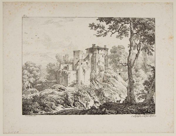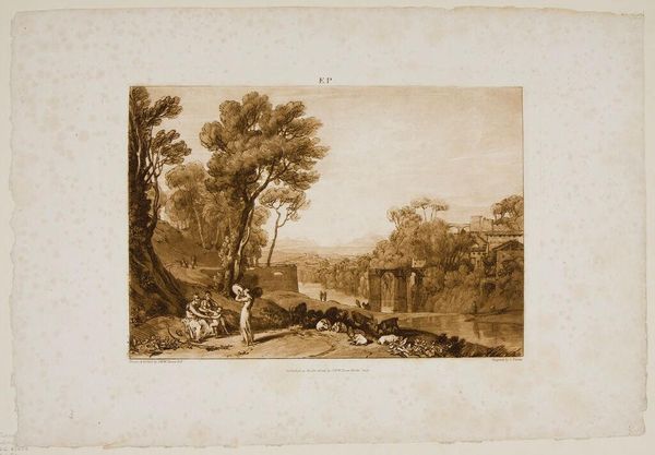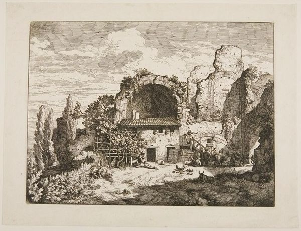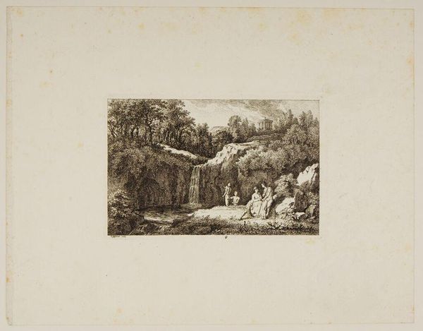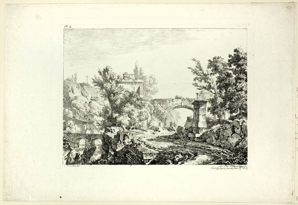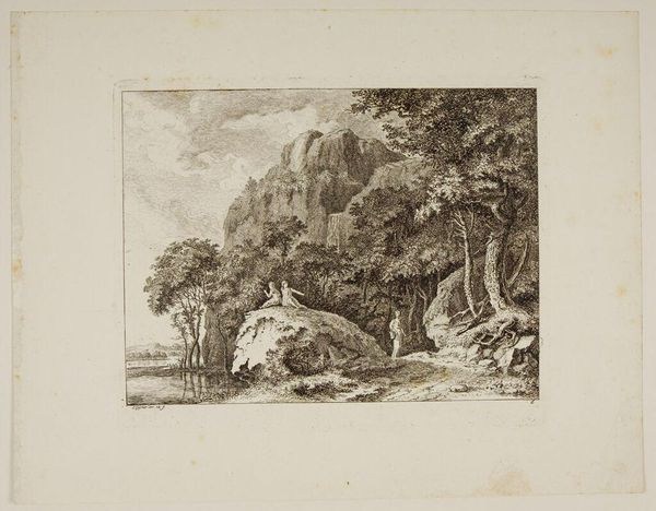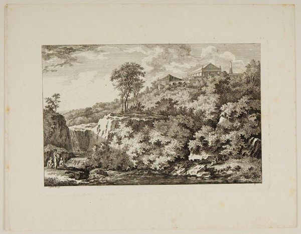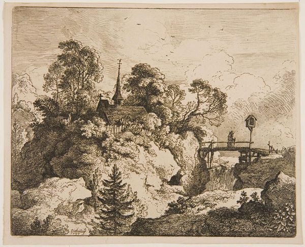 Curator: Salomon Gessner, who lived from 1730 to 1788, created this etching, "Bridge Over a Stream at Foot of a Hill." What do you make of it? Editor: It feels so… delicate! All those tiny lines creating this very peaceful, idyllic scene. It's almost dreamlike. Curator: Gessner was quite interested in classical landscapes, and you can see how he structures the composition with a clear foreground, middle ground, and background. The bridge acts as a visual link. Editor: It's funny, I keep thinking about that little couple walking on the road. Where are they going? What are they talking about? It’s like a tiny story unfolding. Curator: Exactly! Gessner invites us into this space, to imagine ourselves within it. I find the etching process itself incredibly fitting; it's as if the scene is emerging from memory. Editor: Yes, a memory of a perfect, quiet moment. It's a nice reminder to find beauty in the everyday, even in the simplest scenery.